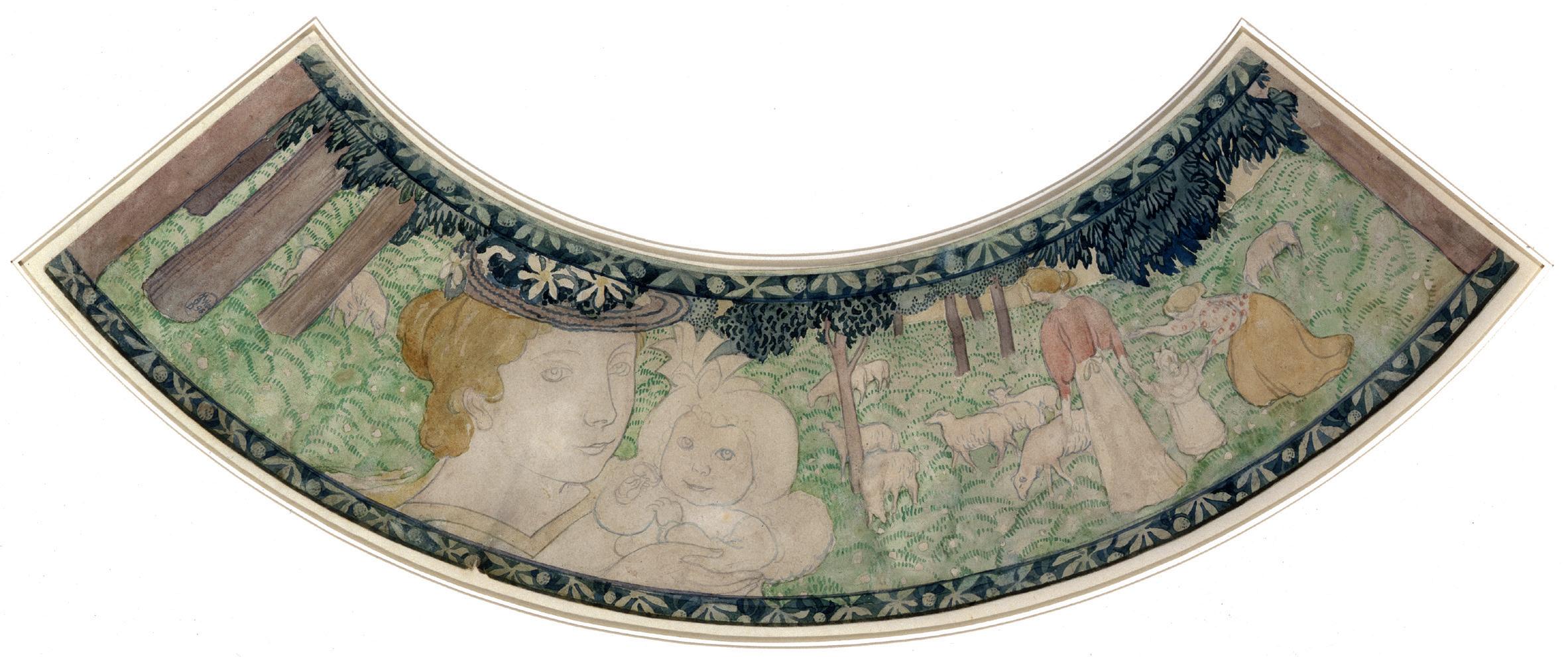 The Nabis’ interest in decoration continued for several years, and its artists often adorned every day, domestic objects with designs and subjects that related to Nature and the family. This is the case for Denis’ superb Marthe et Noële aux brebis lampshade drawing, for which the artist skilfully managed to combine an intimate portrait of his wife and their first daughter