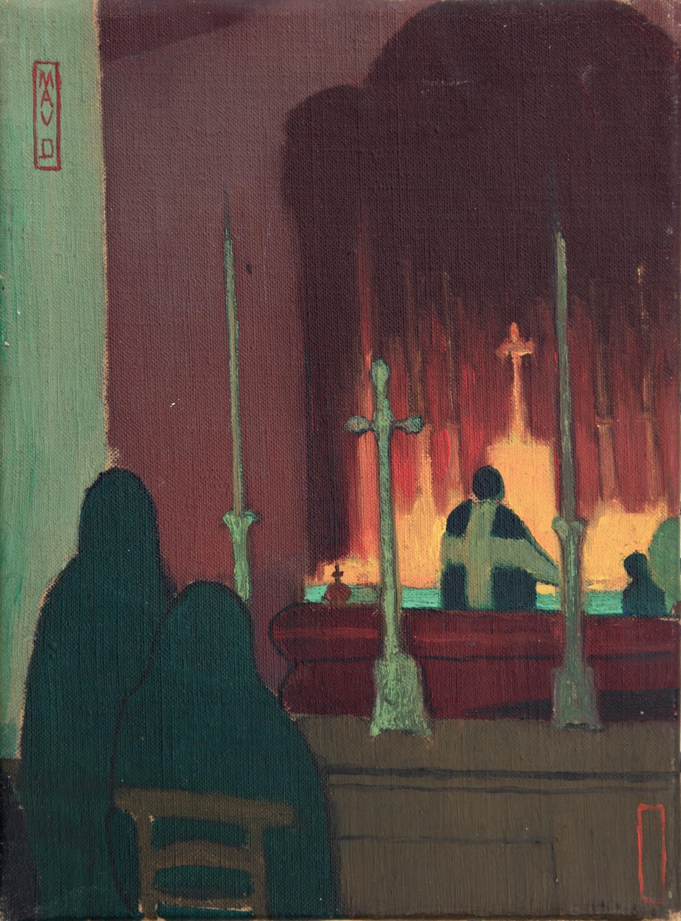This is how Maurice Denis described his faith and his early attraction to art in 1885. In creating this painting, the artist was directly inspired by a religious service in the chapel of the Virgin in the church of Saint-Germain-en-Laye, and he sought to represent God without recourse to realism or traditional means of depiction. Through form, line, and colour, Denis suggests the presence of divine light during the celebration of the mass, particularly as it is manifest in the bright yellow of the altar. The aesthetics of the liturgy and parish life were a continual source of inspiration for Denis, as shown in early works such as La Prière au livre jaune (ca. 1889, Private collection), or Le Christ vert and La Messe (both 1890, Musée d’Orsay, Paris). These works underscore the artist’s dual religious and artistic vocation—as he himself said, “It is there that my artist’s soul and my Christian heart are founded.”2 The painting’s bright palette, which helps to express this Christian fervour and spiritual miracles, is accentuated by its flat treatment of the paint. Its forms, stripped of nearly all detail, are inspired by the Synthetism developed by Paul Gauguin, and they articulate Denis’ own desire to use the plastic means of painting to express the essentials of an idea. In this work, that vision is applied precisely, and it communicates the inseparable link between religious