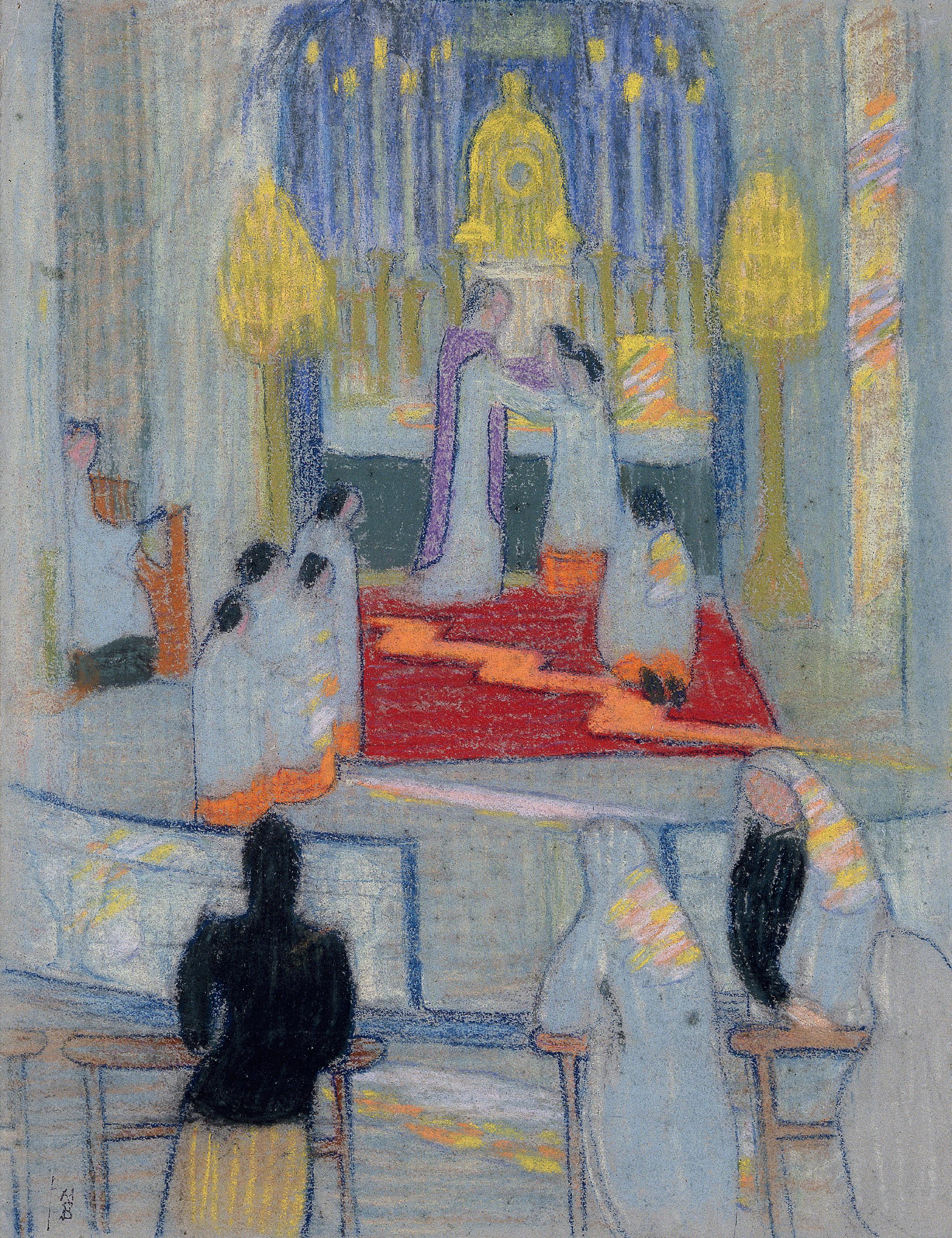 His use of pure, radiant yellow for the altar and the candelabras suggests the light of the divine presence, as it does in the work La Messe of 1890 (Private collection).