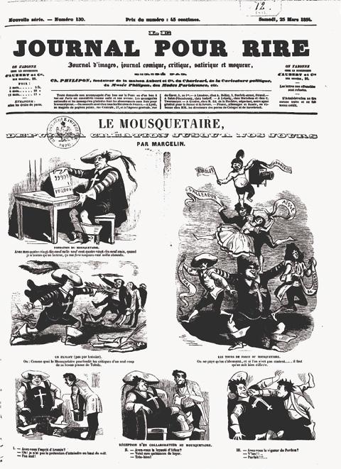 episodes from Dumas’s busy life inspired the latter. His journeys to Italy (made between the 1830s and the 1860s) and Russia (made in 1858–59) gave rise to veritable “comic strips” in the newspapers, and Cham depicted Dumas’s travels extensively in Le Charivari The 1847 opening of the Théâtre-Historique, Dumas’s 1853 return to the Paris stage after his exile in Brussels, and the founding of Dumas’s literary journal Le Mousquetaire that same year were similarly satirized. The turbulent fortunes of Le Mousquetaire, which ran until 1857, gave rise to graphic “gags” that spoofed its successive failures and revivals through comic repetition. Even the lectures Dumas gave between 1864 and 1866, in France and elsewhere in Europe, provoked two amusing cartoon series, in L’Univers illustré and Le Charivari respectively.