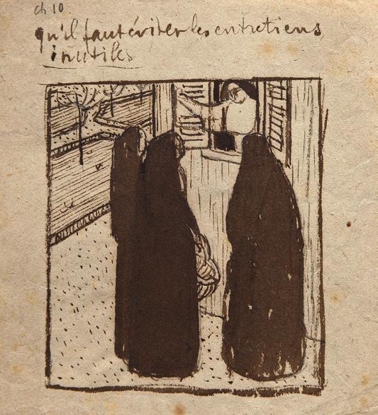 At this point, though Denis was only at the early stage of iconographic research, he had already produced hundreds of sketches for the project. The great number of compositions listed in connection with L’Imitation – an exceptional group of which this catalogue presents – underlines the artist’s enthusiasm for this work. Yet above all, it was his constantly renewed interest in the textual source, its call to religious meditation, that inspired him greatly. “[H]is evenings are all filled by the illustrations for L’Imitation”.8 Denis would ultimately work on these drawings from 22 November 1893 to September 1899, as indicated by the annotation at the bottom of the illustration on page 443, corresponding to the last chapter of the edition.
