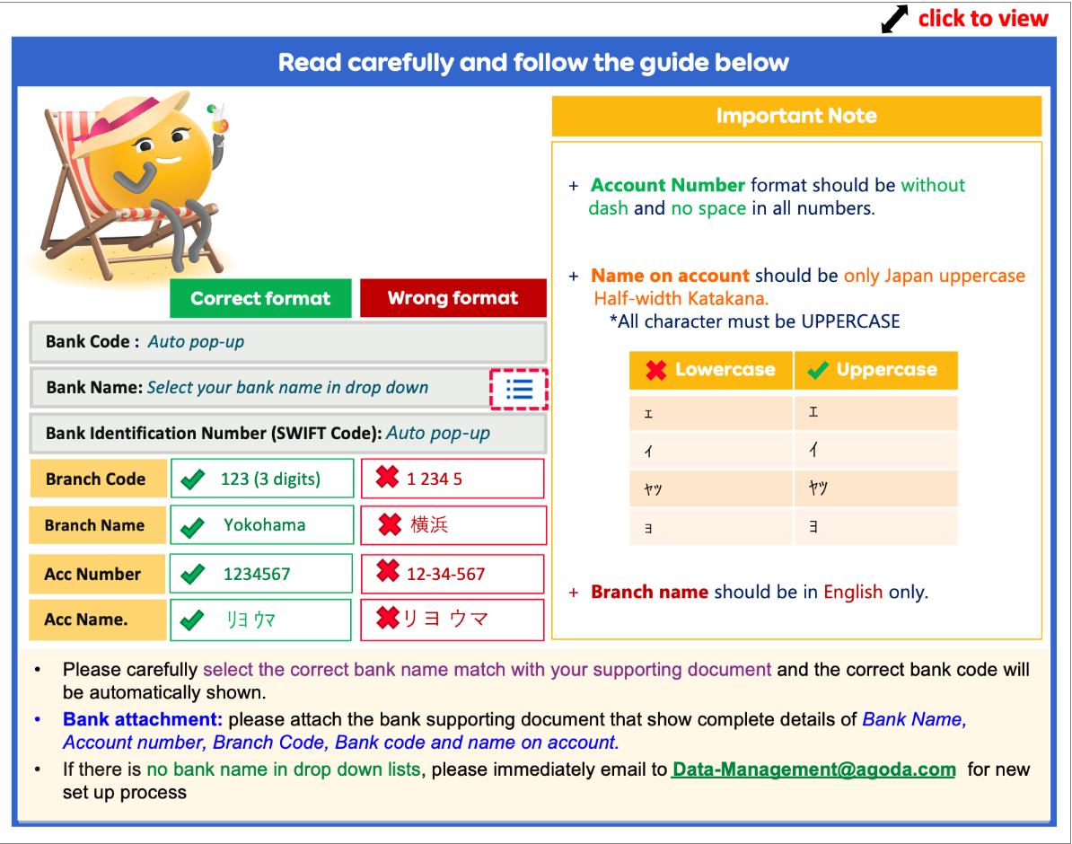 • Name on Account : Please input name on account to be in Half-width Katakana and add single space between surname and given name