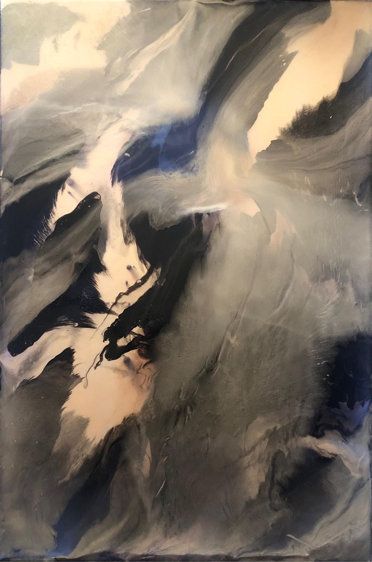 Marbled patterns, expansive ink dilutions, superimpositions, intersections challenge and reverse our visual status quo, offering fodder for reflection. Harmonious fluctuations of palettes and geometries create visual continuance across the front space, flowing beautifully into the mezzanine and skylight room in the back, taking the viewer on a tantalizing journey through objective and subjective planes of existence.