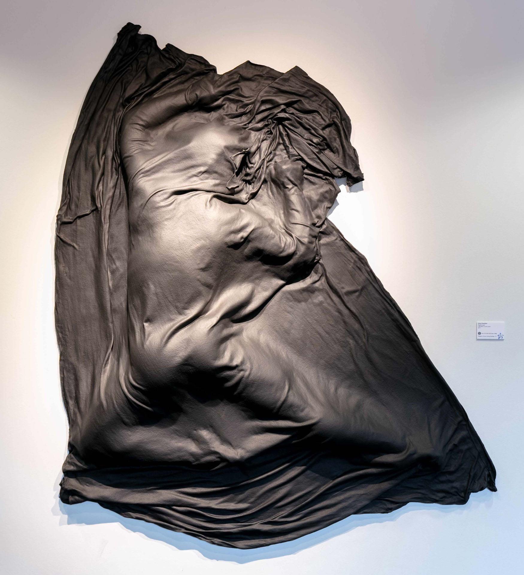 Certain Fluidities is a group exhibition of paintings, photographs, and sculptures that explores changeability across the physical, psychological, and perceptual. The show features work ranging from acrylic and oil paint to digital collage, ink, and textiles. Fluidity is examined from the point of view of tangible and intangible narratives. Forms mold and transform with ease, their soft contours blending seamlessly with the background, so that we cannot tell what lies below or above, behind or before, within or without. What appears at first glance reveals a different reality upon further observation: a turtle-shaped silhouette is the shadow of a person; hefty bronze-looking sculptures are hollow and made of light fabric; a tight-worn sweater on a woman’s body is a thought-provoking tapestry on gender dynamics.