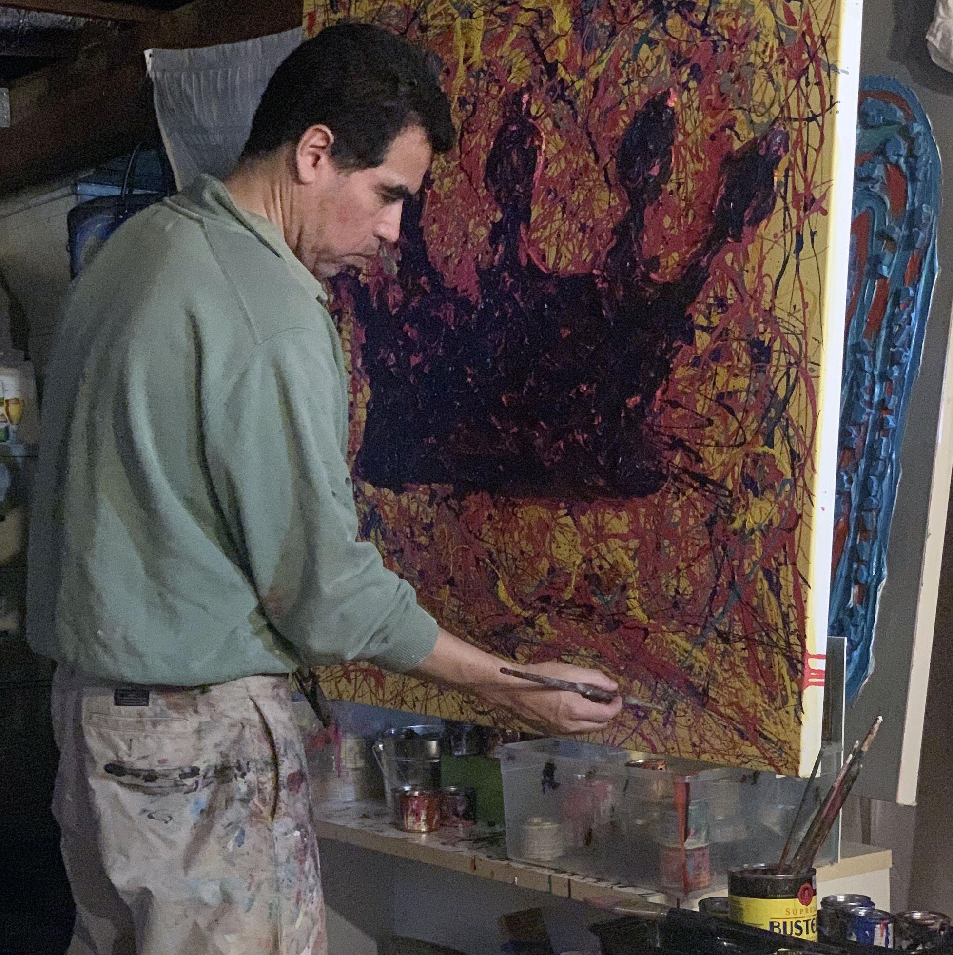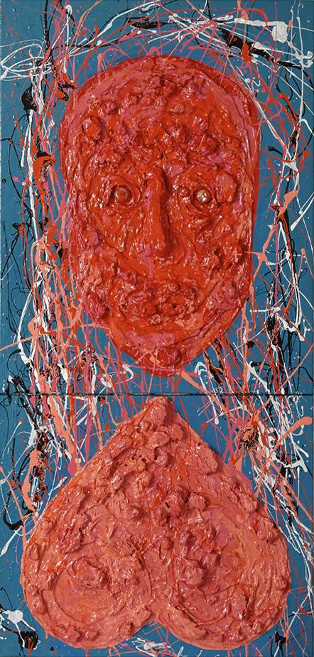 Using a dripping technique with acrylic and enamel paint, Caceres weaves intricate circuits that symbolize the heaviness and complexity of the human mind and psyche. The surface is clad in layers of paint, mixed with modeling paste, or paired with grotesque paper-mache characters emerging from the background. Caceres’ hearts and brains are damaged organs, hardened by a lifetime of neglect and self-abuse. Like defibrillators, his works inject powerful shock waves through our system–a last-ditch attempt toward self-awareness and love.