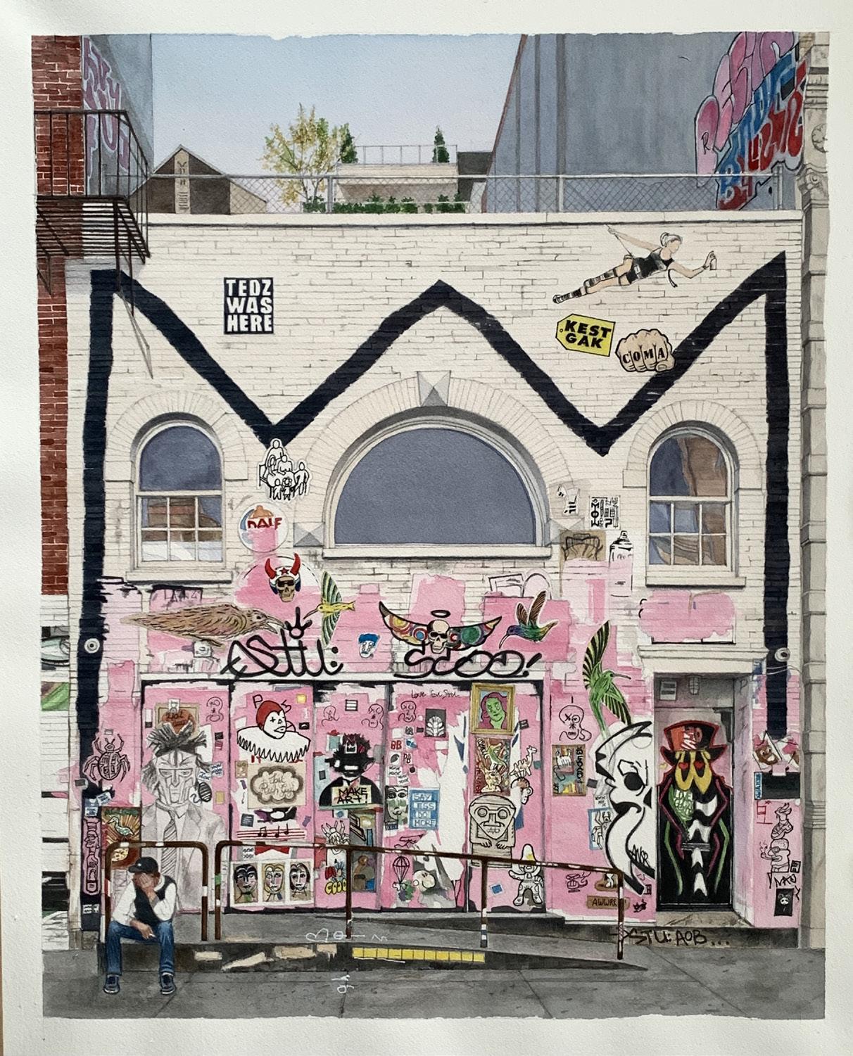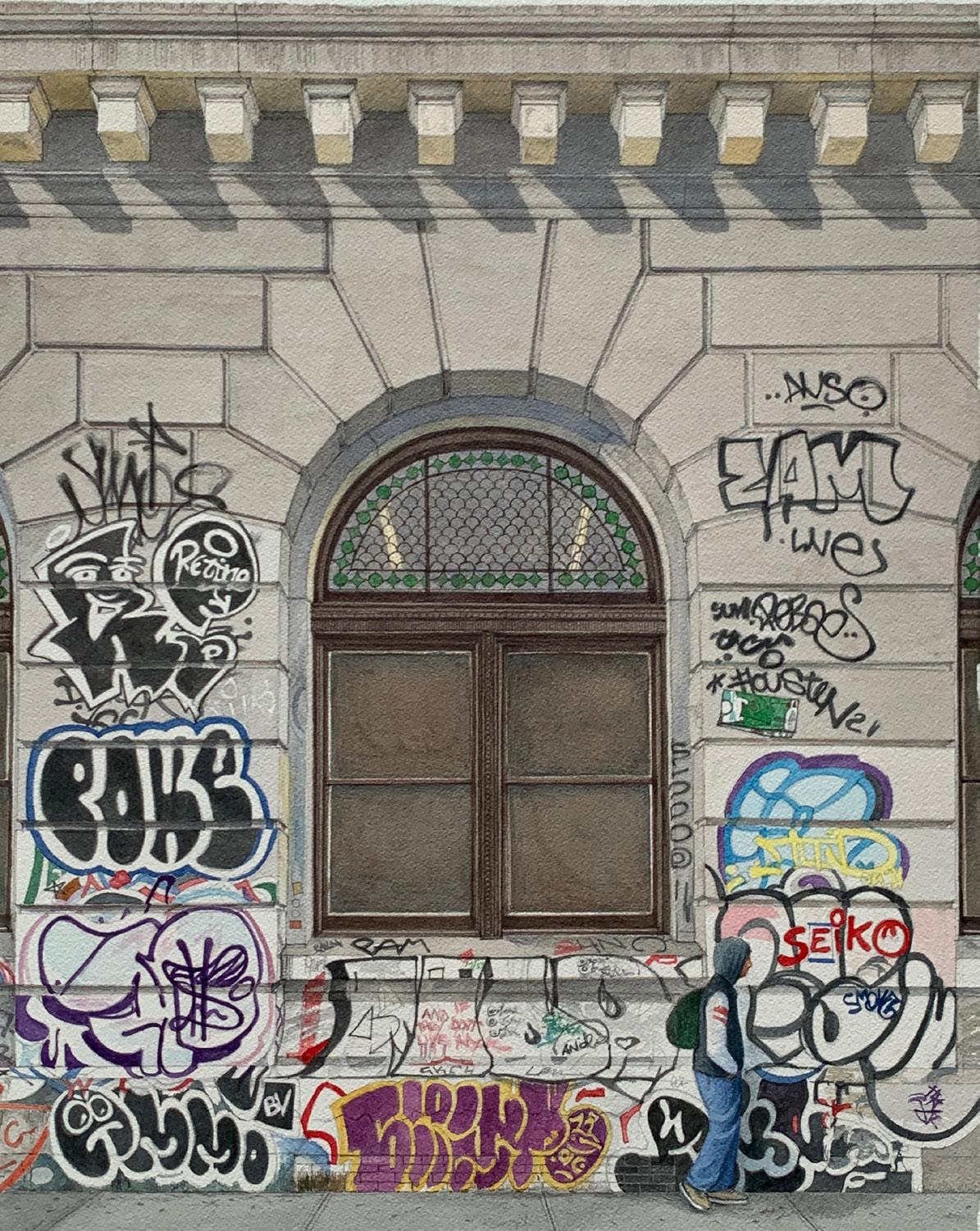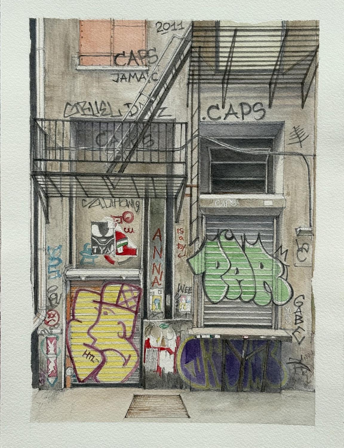Her subject is the city itself. The walls of the Lower East Side, Soho, and the West Village— layered with graffiti, murals, and fragments of visual protest—become her archive. What is often temporary and at risk of erasure is carefully documented through her lens before being reinterpreted in watercolor.
