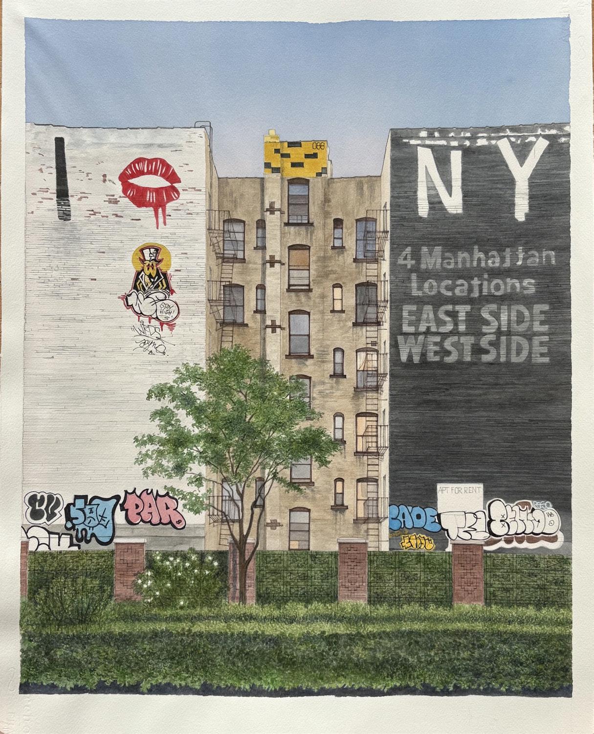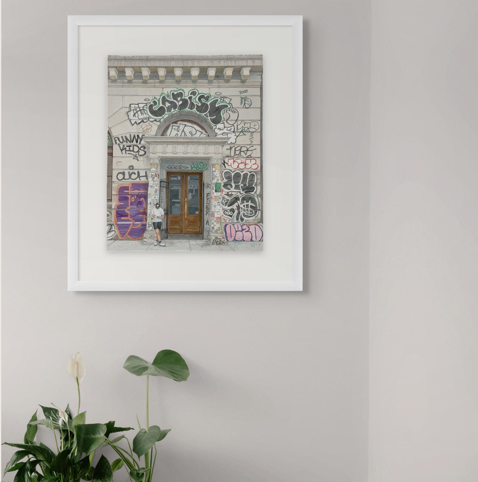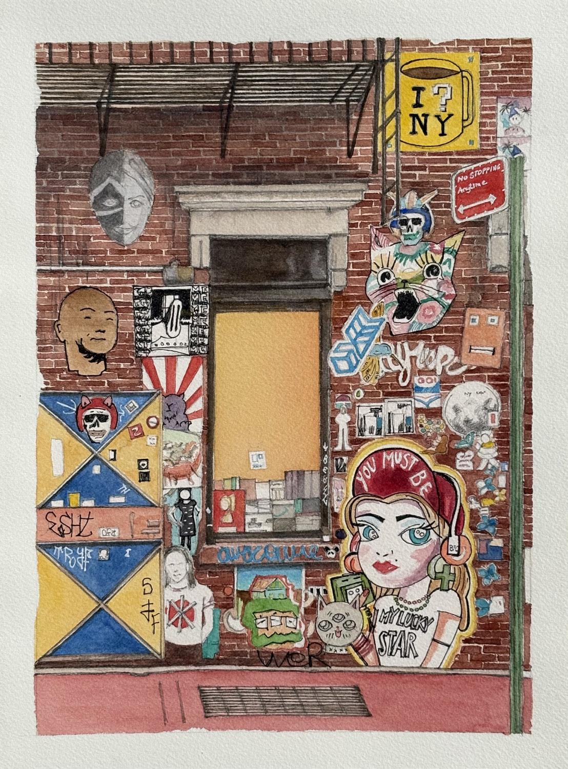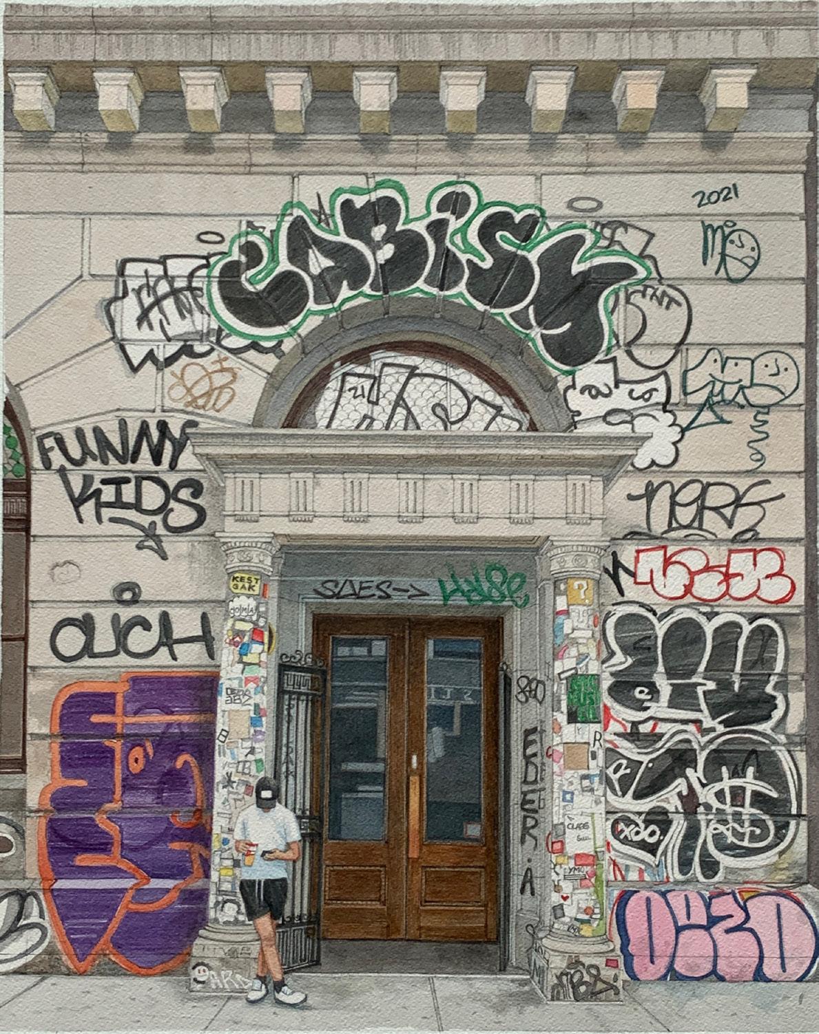 Her subject is the city itself. The walls of the Lower East Side, Soho, and the West Village— layered with graffiti, murals, and fragments of visual protest—become her archive. What is often temporary and at risk of erasure is carefully documented through her lens before being reinterpreted in watercolor.