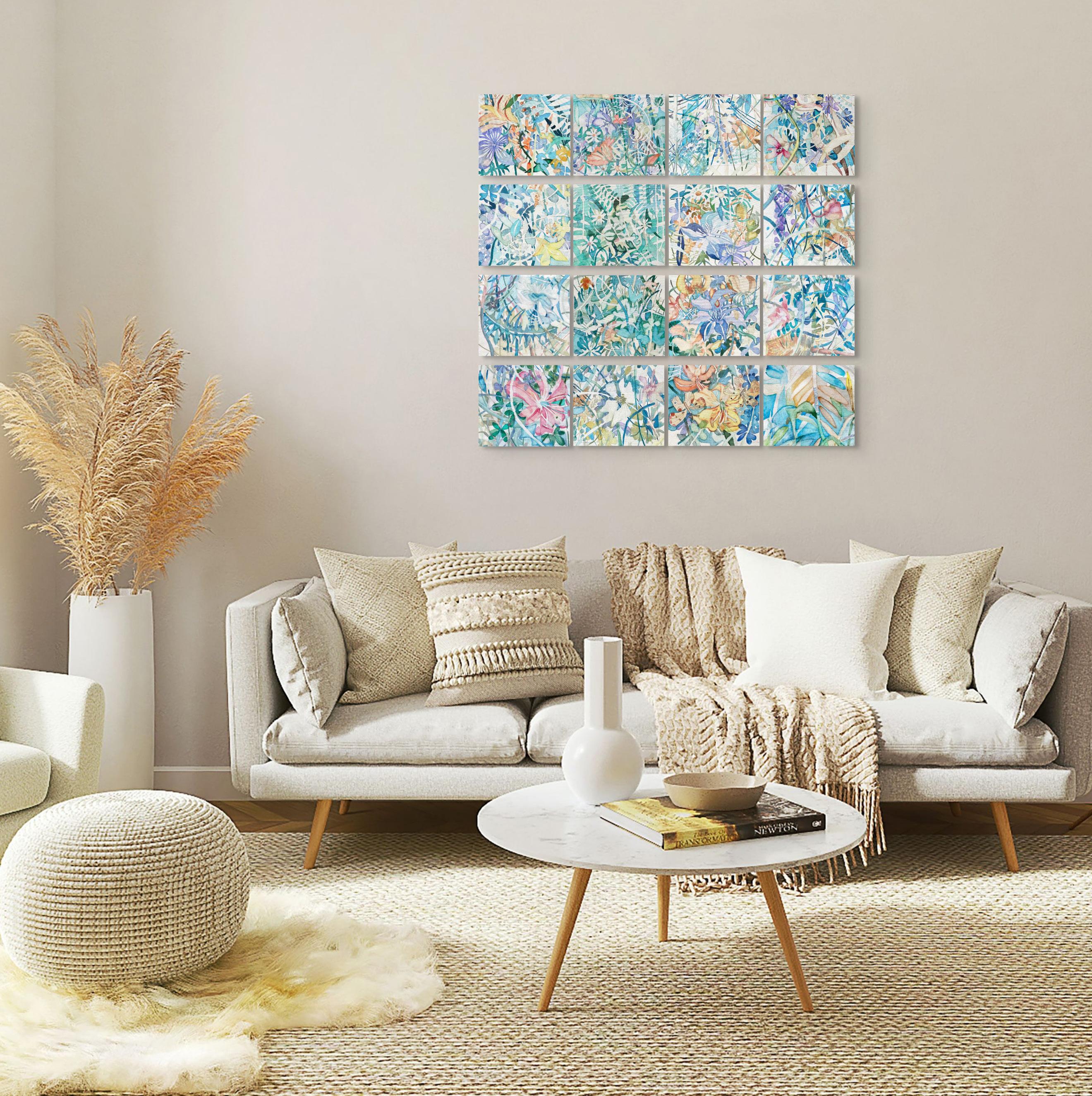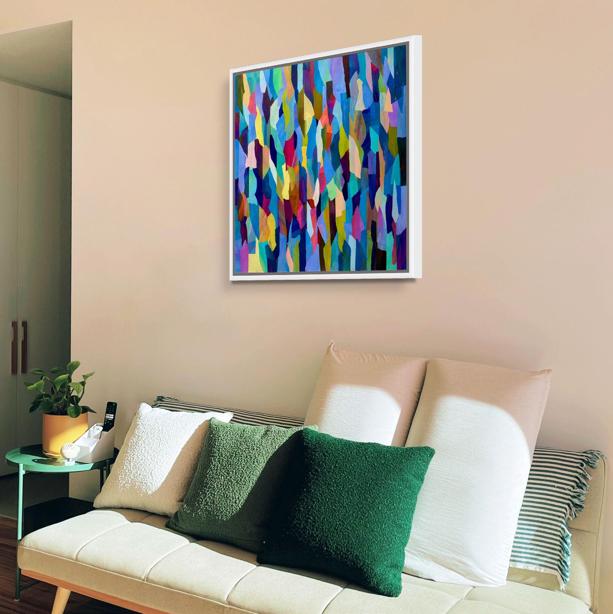 Using acrylic inks and natural pigments on canvas, she embraces the fluid nature of the medium, allowing textures to settle gently across the surface, echoing watercolor while maintaining clarity and structure.