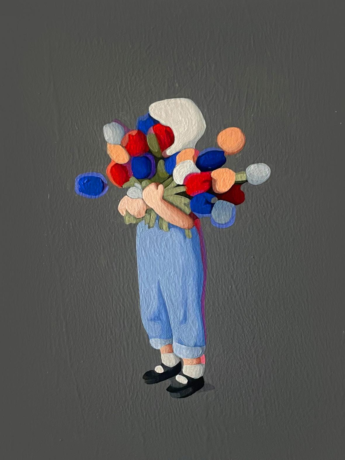 Her work begins with plants and flowers, yet it does not remain in realism. Forms are softened into geometry. Colors are restrained, subtle, and balanced. Each composition feels measured and intentional, guided by rhythm rather than detail.