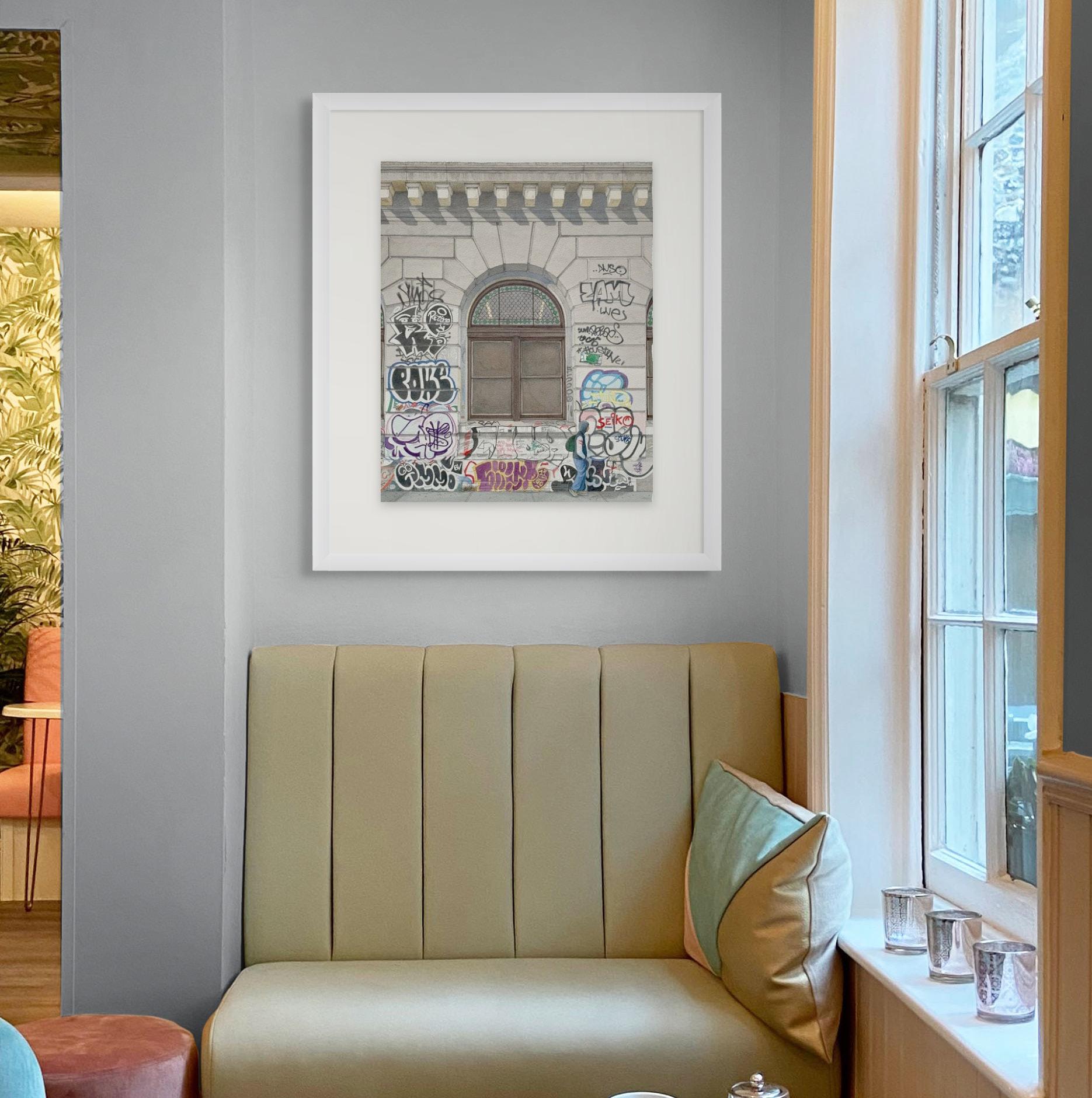 Laila J begins with photography, then moves to detailed drawing, and finally to transparent washes that build into luminous, layered compositions. The fluidity of watercolor allows her to echo the fragility and immediacy of street art while preserving its intensity.