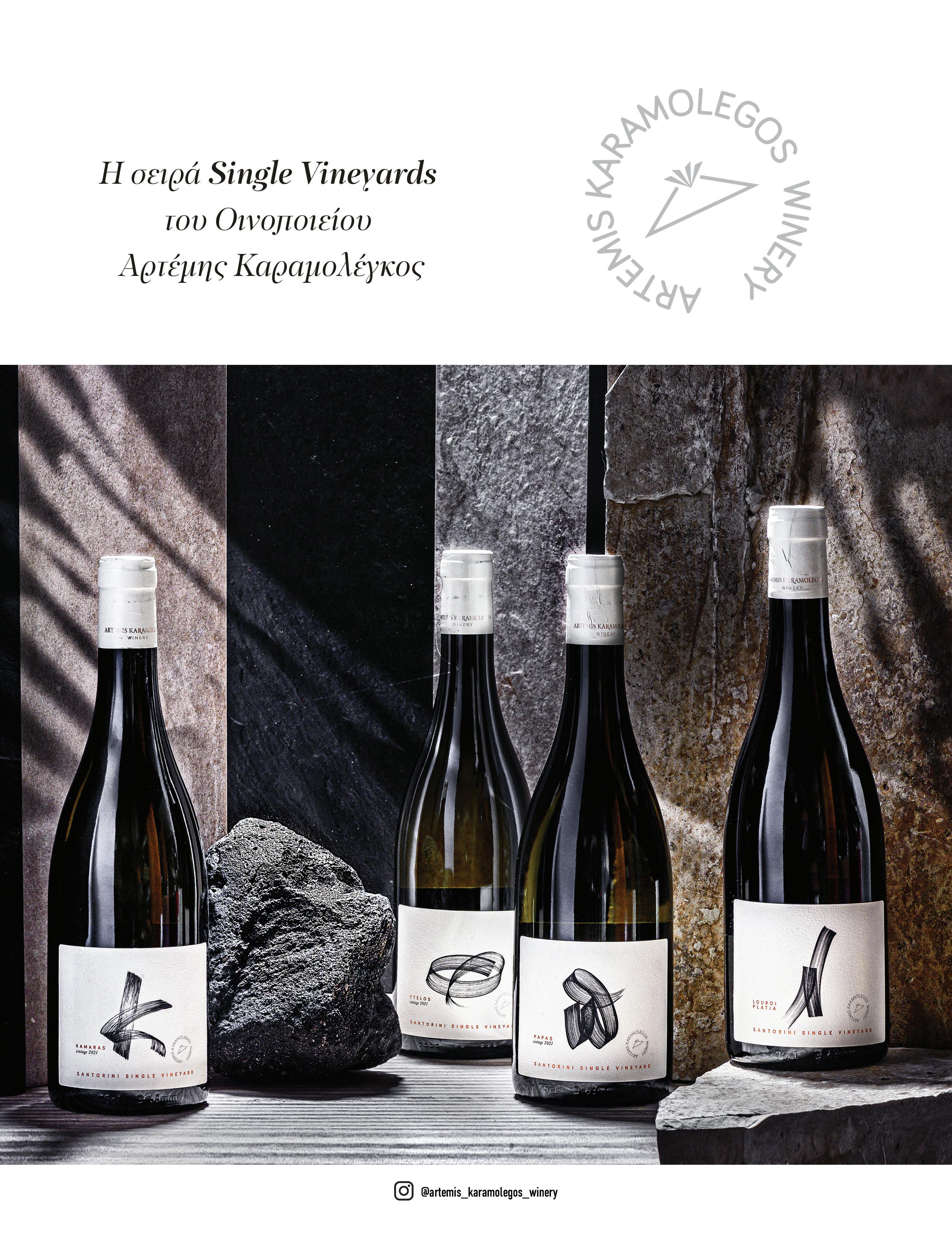 Η σειρά Single Vineyards του Οινοποιείου Αρτέμης Καραμολέγκος αποτελείται από κρασιά με άψογη ποιότητα από μοναδικά κτήματα στη Σαντορίνη. Πρόκειται για μια σειρά περιορισμένης παραγωγής που προέρχεται από τους καλύτερους αμπελώνες του νησιού, υπόκειται σε μικροοινοποιήσεις και παράγεται μόνο τις χρονιές όπου οι συνθήκες ευνοούν ένα άψογο αποτέλεσμα. Η οινοποιητική προσέγγισή τους είναι κατά βάση άκρως μινιμαλιστική, μιας και χρησιμοποιούνται κάθε φορά τα ίδια αδρανή δοχεία κατά τη διαδικασία της οινοποίησης, επιτρέποντας έτσι στο κάθε αμπελοτόπι να εκφραστεί με όσο το δυνατόν λιγότερες παρεμβάσεις.