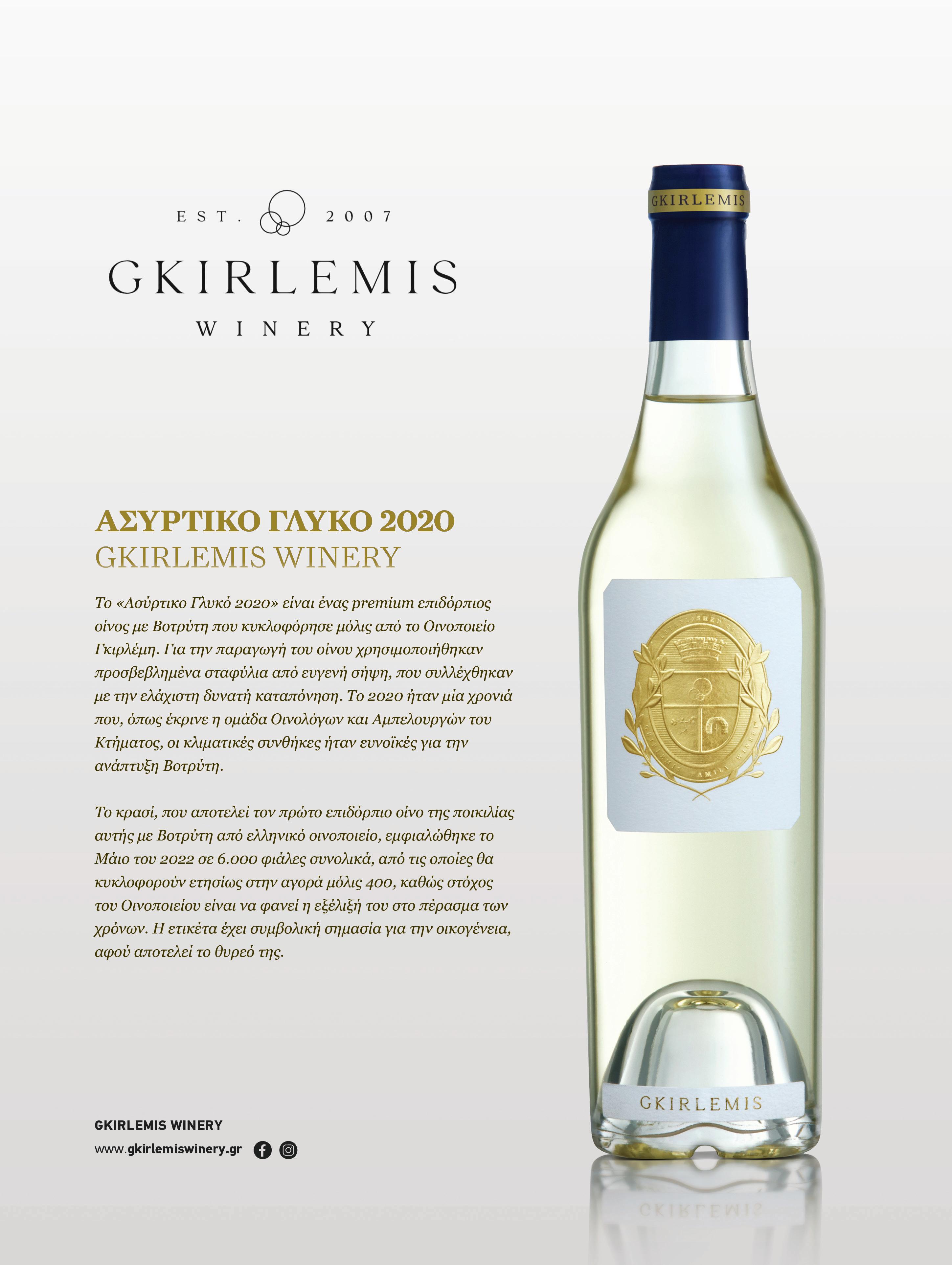 υφή, ισορροπία και δυνατότητα παλαίωσης. Η οινοποίηση γίνεται με κρυοεκχύλιση σε ανοξείδωτες δεξαμενές και ζύμωση σε ελεγχόμενη θερμοκρασία