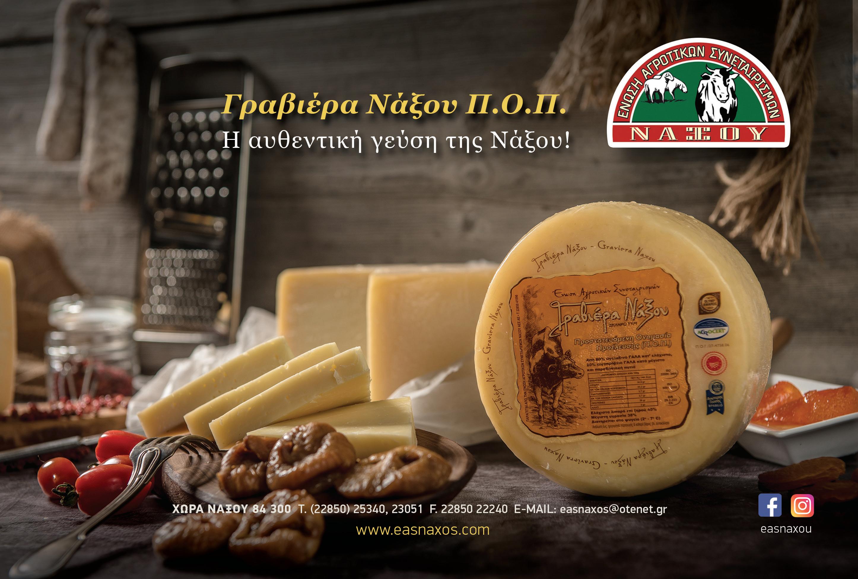 Η Γραβιέρα Νάξου ΠΟΠ είναι, αναμφίβολα, η «ναυαρχίδα» της παραγωγής και το πιο μεγάλο καμάρι της Ένωσης Αγροτικών Συνεταιρισμών Νάξου. Ήταν εν έτει 1955, όταν κάποιοι από τους αγροτοκτηνοτρόφους της Νάξου θέλησαν να φτιάξουν το δικό τους τυρί, λόγω του ότι η αγελαδοτροφία αναπτυσσόταν τότε γοργά και η παραγόμενη ποσότητα γάλακτος αυξανόταν. Άρχισαν, λοιπόν, να συγκεντρώνουν το γάλα τους, ενώ η τότε ΕΑΣ Νάξου τούς παρείχε την τεχνογνωσία. Έτσι προέκυψε η Γραβιέρα Νάξου. Μάλιστα, επειδή το προϊόν κέρδισε τους καταναλωτές και η παραγωγή μεγάλωνε, η ΕΑΣ Νάξου προχώρησε (1996) στην πιστοποίηση της Γραβιέρας Νάξου ως προϊόν Προστατευόμενης Ονομασίας Προέλευσης. Η Γραβιέρα Νάξου ΠΟΠ είναι σκληρό τυρί, με υποκίτρινο χρώμα, λεπτή, ξηρή