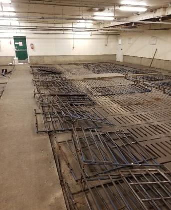 The ooring is full of open slots. These slots allow manure and waste to fall through the oor to the sewage pit below the barn.