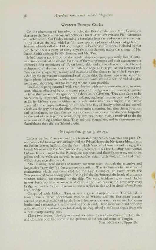 Last year I referred to the fact that the School, with a population of 1,500, was larger than it has e,er been in its long history. Today although the total roll isapproximately the same, the apparent flattening of the curve is explained by the disappearance of the two first Kindergarten classesfrom the scene rather than by the fact that we have at last reached high-water mark. In fact the roll of the Senior School has risen again this year and now stands at r,050 boys. Last year's record of thirty-five boys in Upper VI has been surpassed this year by a figure of just over fifty, all of them possessing the minimum qualification of a University entrance group gained in theScottish CertificateofEducatio n Examination in the 5th year. This has necessitated the creation, for the first time in the history of the School, of two Upper VI classes. Somewhere between 90 and 100 boys are applying for admission to the University this session and it can be safelyassumed in the light of past experience that the vast majority of these ·willbe successful.