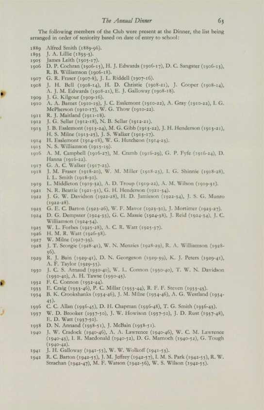 No up-to-date information is available about the following members of the Class, and the Club Secretary would be glad to hear from anyone who can assist in making our records accurate: Harry Ironside Davidson (1910-17), :-,1,n E., James Bisset Davidson (1912.-18),George Deans (19II-21), William Dunningham (1910-16: 1917-19), Charles Gillespie (1910-18) (an actor during World War II), Frederick William Hutchison (1910-19), Lawrence J\laxwcll Stanley Knight (19u-13), Alexander Stronach Marr (1913-14) (manager of a laundry chain in ~faryland, U.S.A, in 1949), William Stephenson Murray (1910-17), Patrick Buchan Robertson (1910-16), Frederick Smith (19n-15), and James Douglas \'food (19n-22) .