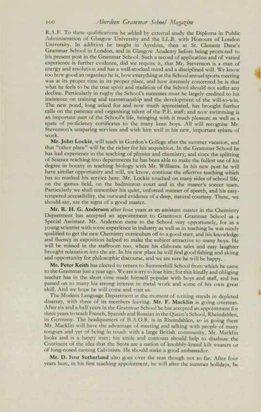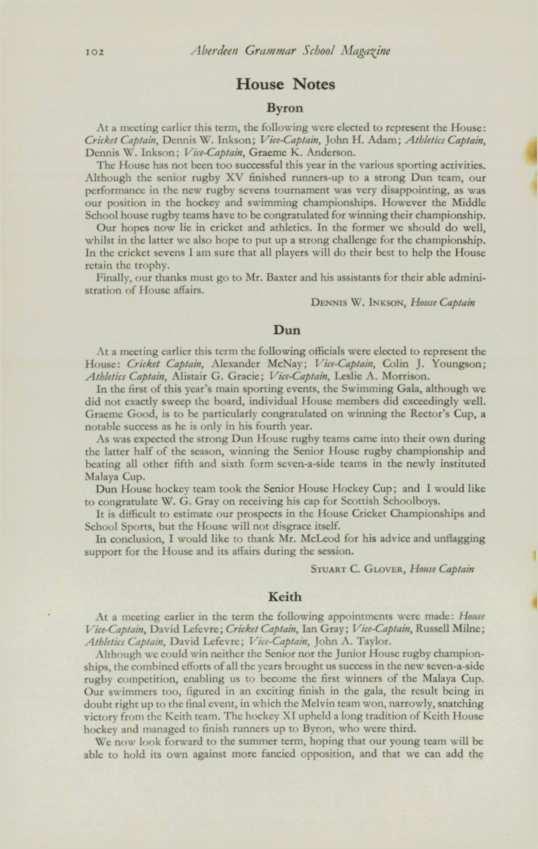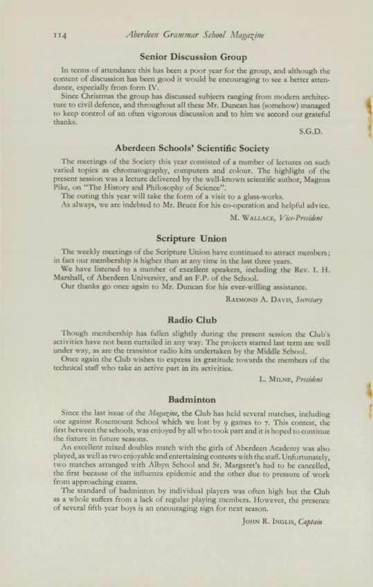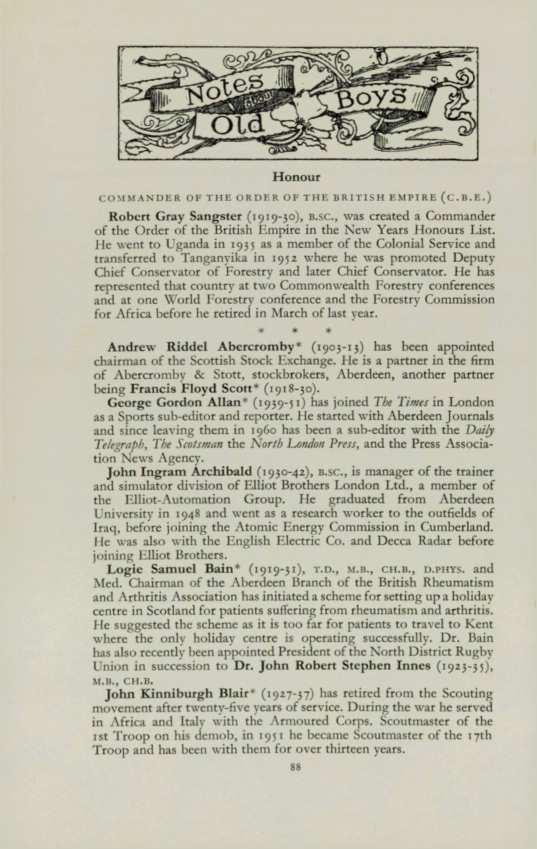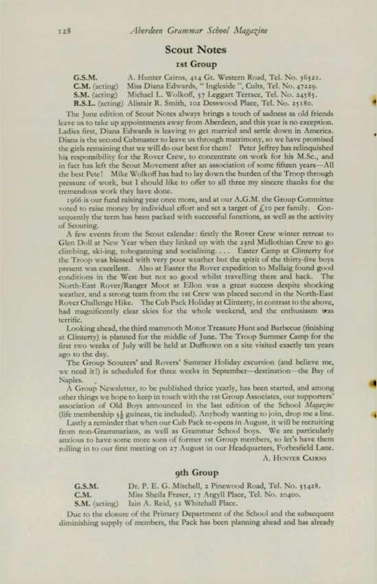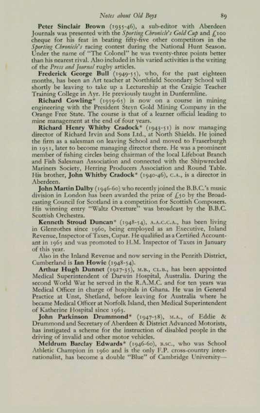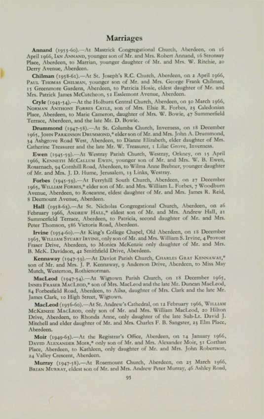 ANDERSON,Brian G. (1963-65), 24 Hammerfield Avenue, Aberdeen. ANDERSON,William Francis (1958-64), 41 Byron Avenue, Aberdeen. BLAIR,Donald C. (196o-65), 95 Cromwell Road, Aberdeen . BYTHEWAY, David (1952-63), 263 Birkhall Parade, Aberdeen. CowuNG, Richard (1959-65), Protea House, Jan Hofmeyer Road, Welkom, Orange Free State, South Africa.