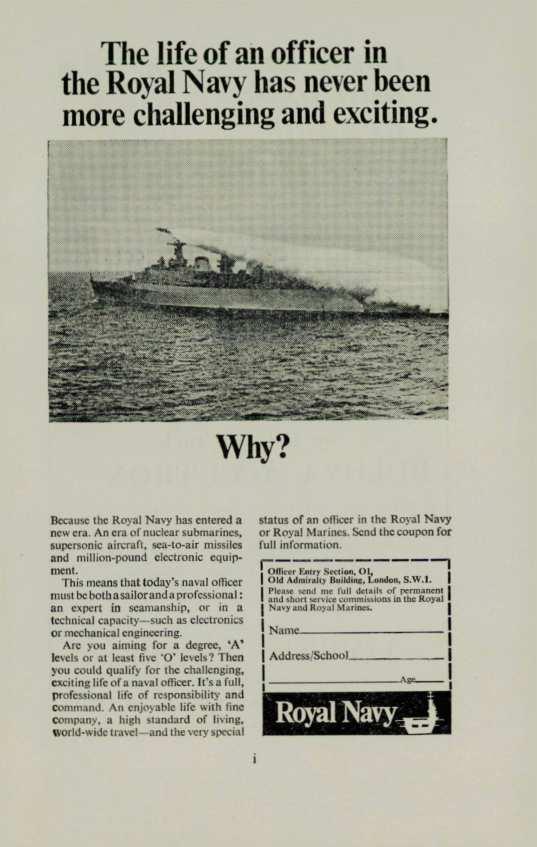 This meansthat today's naval officer mustbebotbasailorandaprofessional: an expert in seamanship, or in a technical capacity- such as electronics or mechanicalengineering. Arc you aiming for a degree, 'A' levels or at least five 'O' Je.,.els? Then you could qualify for the challenging, excitinglife ofanaval officer. It's a full, professionnl life of responsibility and command. An enjoyable life with fine company, a high standard of living, world-wide tra,cl and theveryspeeial
