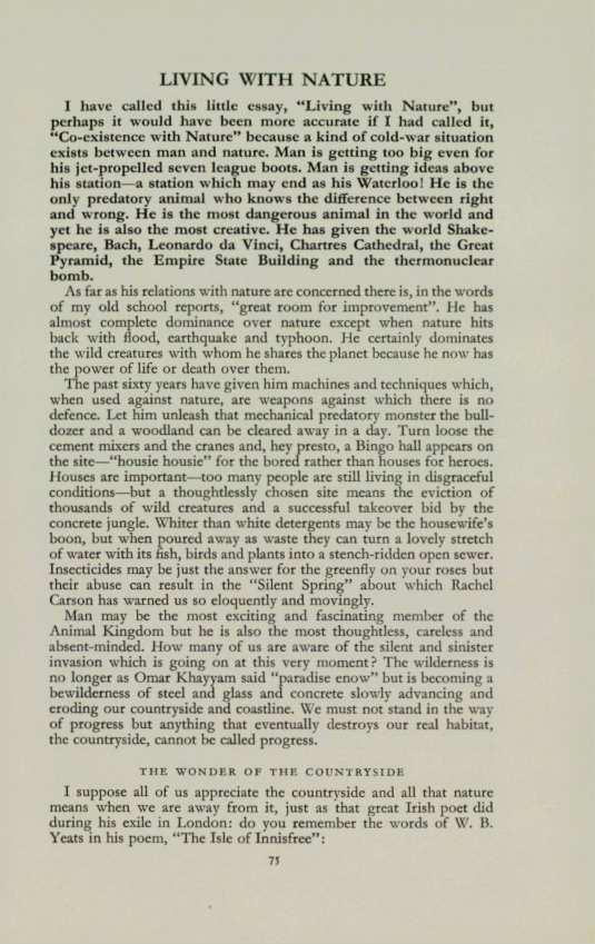 I have called this little essay, "Living with Nature", but perhaps it would have been more accurate if I had called it, "Co-existence with Nature" because a kind of cold-war situation exists between man and nature. Man is getting too big even for his jct-propelled seven league boots. Man is getting ideas above his station-a station which may end as his Waterloo ! He is the only predatory animal who knows the difference between right and wrong. He is the most dangerous animal in the world and yet he is also the most creative. He has given the world Shakespeare, Bach, Leonardo da Vinci, Chartres Cathedral, the Great Pyramid, the Empire State Building and the thermonuclear bomb.
