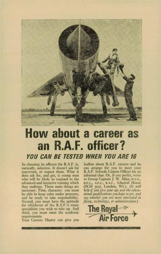 leaflets about R.A.F. ~reer~ and he can arrange for you to meet )our R.A.F. Schools Liaison Officer for an informal chat. Or, if)OU prefer, 11ritc to Group Captain J. \\;. Allan, o s.o., D.F.C., A.F.C., R.A.F., Adastrnl House (SCII 305), London, \\'C1. (ft will helpi/you g,re your age a11J tire educationalqualificationsyou /ropelo grl, a11J say whetherJ'Ou are more i11tere.1tt'di11 flying, ttdmology, or ad111i11i11ratio11.)