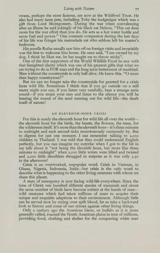 For this is surely the eleventh hour for wild life all over the worldthe eleventh hour for the birds, the beasts, the flowers, the trees, for the wilderness itself. It's more than the eleventh hour- it's three minutes to midnight and each second ticks monotonously ominously by. But to digress for just one moment. I can remember talking to 2,000 children in Thailand. I was told that they could understand English perfectly, but you can imagine my surprise when I got to the bit in my talk about it "not being the eleventh hour, but more like three minutes to midnight" when 2,000 little wrists were lifted and twisted and 2,000 little shoulders shrugged in surprise as it was only 3.30 in the afternoon!
