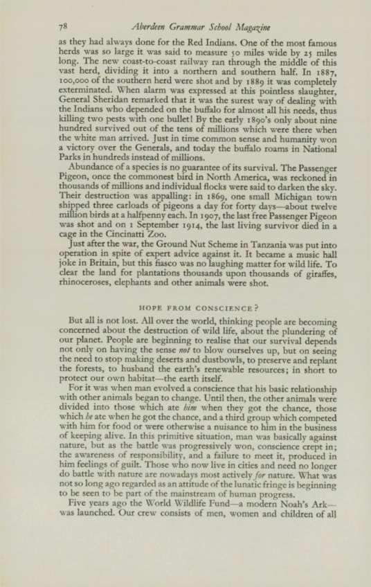 A state of emergency is now facing wild life everywhere. Since the time of Christ one hundred different species of mammals and about the same number of birds have become extinct at the hands of manwild creatures which had taken millions of years to acquire their unique and exquisite adaptions to their environment. Although little can be served now by crying over spilt blood, let us take a backward look at history and some of our crimes against other living things. Only a century ago the \merican bison, or buffalo as it is more generally called, roamed the orth American plains in tens ofmillions, providing food, clothing and shelter for the conquering white man