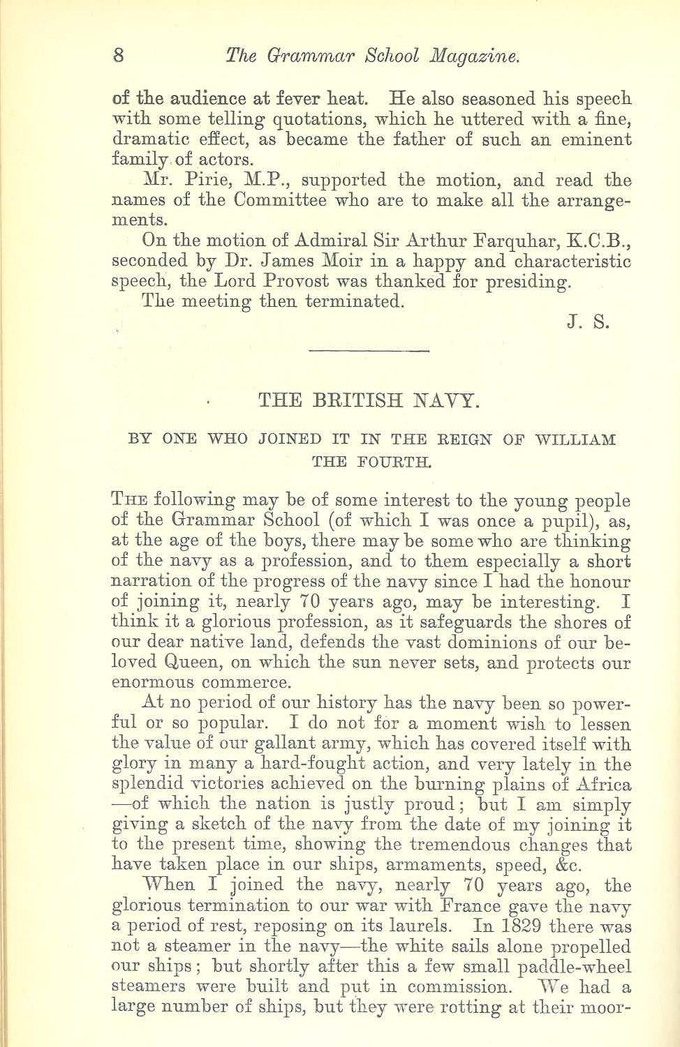 THE following may be of some interest to the young p eople of the Grammar School (of which I was once a pupil), as, at the age of the boys, there may b e some who are thinking of the navy as a profession, and to them especially a short narration of the progress of the navy since I had the honour of joining it, nearly 70 years ago, may be interesting. I think it a glorious profession, as it safeguards th e shores of our dear native land, defends the vast dominions of our beloved Queen, on which the sun never sets, and protects our enormo us commerce.