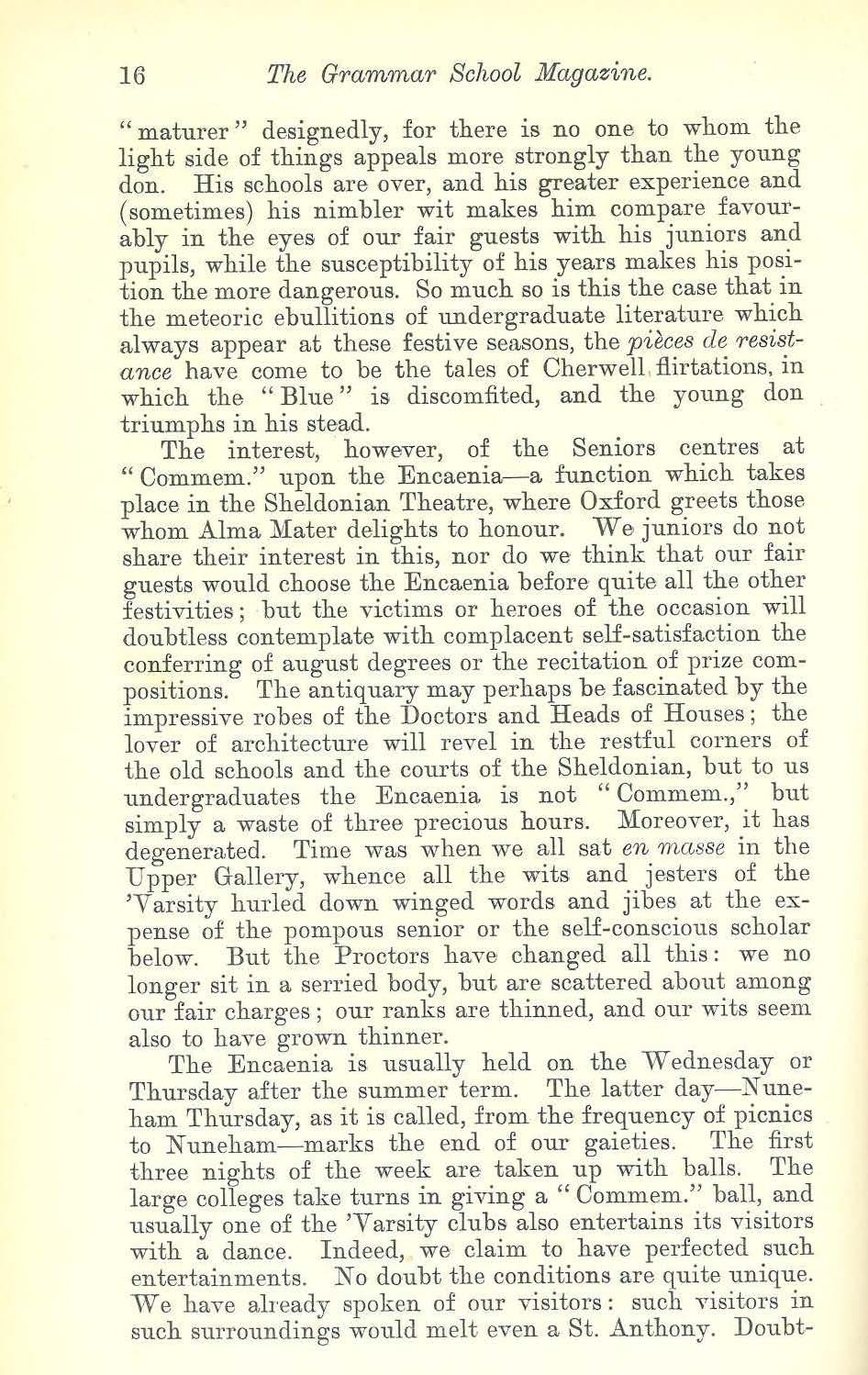 WHEN your Editor asked me to write some impressions of modern U niv ersity life at Oxford, he suggested to me the choice of two subjects to deal with-Oxford Athletics or Commemoration. I ha,e chosen the latter, partly as representing that side of our University career which seems to be wholly absent from the Scottish seats of learning, and partly as being free from the taint of o,er-seriousness, which is ineYitably bound up with all our athletic hopes and fears. Modern Oxford, it must be said, and we are proud to say it, is ne,er over-serious, and "Commem.," with its flOunds of revelry by day and night, its balls and picnics, its rambles through court and cloister, and the pleasant hours of peaceful friYolity on the shady banks of the Cherwell, is consequently more characteristic of Oxford, as ci whole, than the toil of the labouring oarsman and the harsh, croaking ,oice of his coach. "Xot without dust and heat," though indissoluble from an athletic career, is inapp licable- no phrase m ore so-to the dolce .fa1· niente which young Oxford loves. This side, I fear , you do not enjoy in Aberdeen, where Alma :l1ater seems rarely to smile upon her alumni: perhaps the shades of :Melvin haunt the place, and remind you relentlessly that life is gra,e and l ife is earnest; but, whate,er the cause, the fact is, I think, undeniable. Compared with our sombre acarlemic garb, your scarlet gowns raise hopes that we shall find in the High Street of Old Aberdeen that the sprightlier :l1uses have their devotees as well as their more serious sistel'S. But the s::arlet gown is, we fear, but a lying witness, like the old crumbling fronts of Oriel or