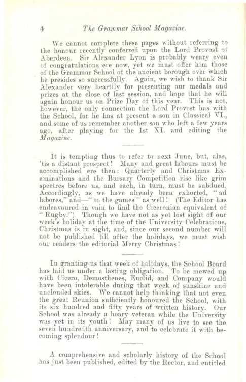 \'ire cannot complete these pages without referring t() the honour recentl~· conferred upon the Lord Provost 'lf Aberdeen. ~ir Alexander Lyon is probably weary e,en of congratulations ere u01,, yet \,:e must ofter him th?se of the Grammar School of the ancient borough over which he presides so successfully. Again, we wish to thank Sir Alexander very heartily for presenting our medals and prizes at the close of last session, and hope that he "·ill again honour us on Prize Day of this year. '!'his is not, however, the only conuedion the Lord PrnYost has with the 8chool, for he has at present a son in Classical YI., and some of us remember another son who left a fe\, years ago, after playing for the 1st XI. and editing· the ·.Ma_qazine.