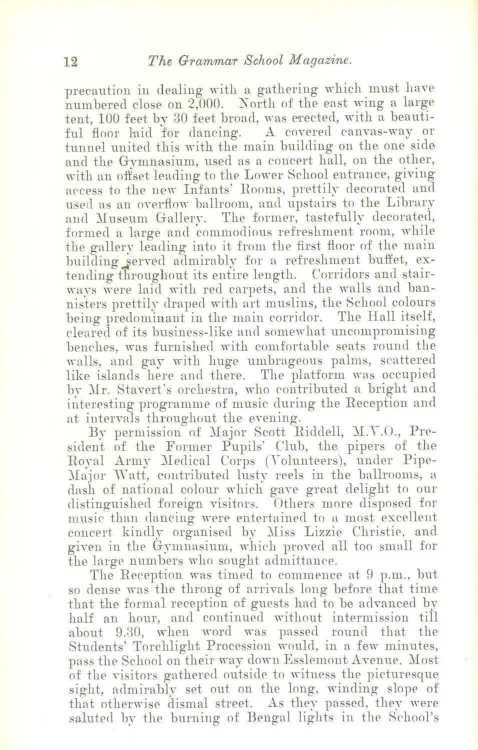 By permission of }Iajor Scott Riddell, }I.Y.(J., Prrsitlent. of the Former Pupils' Club, the pipers of tlie Royal Army }Ieclical Corps (Yolunteers), under Pipe:1Iajor '\Yatt, ccrntribntecl lust~- rePls in the ballrooms, a clash of national colour "·hich gayr great delight to our distinguished foreign Yisitors. Other~ more disposed -for musir 1han clancing wprp entert.1inec1 to a most excPllellt co11cert kincll_,- organised by }Iiss Li;r,zie Christie, and giYen in the Gymnasium, '"hich proYecl all too small for the large>numbers whn sought admittanr·r.