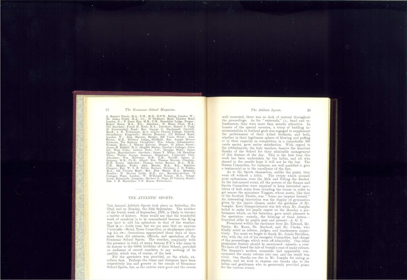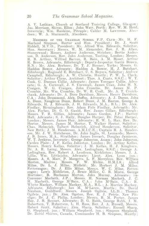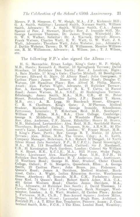 H. G. Bannochie. Eman Lodge. King' s Gate; H. P. Sleigh, J\LB. , Hants; Kenneth J. Hector, 10 Springbank Terrace; David Htrachan, H Ruhisla11· Den );orth; Rev . J. Lendrnm , Elgin; A. Bain .\lackie, 17 1-::ing's Gate: Charle~ .:llitchell. 33 Beechgrove Terrace ; Ed1rnrd G .\lan , 5,3 Albury Road: John Grorge;;on, li Carlton Place; James "'· .\lonrn , So Ashley Road; Douglas C. Watson, 13S Hamilton Place; Rev. Alfred .:11. Philip, l\Ia11se, Avoch; ..\lex. Forlws "·ight, Advocate. :21 R11bisla1Y Terra ce; Rev...\.. Easton Spence, Larbert; R. K. T. Catto, 14 Forest Road; .James \Yatson, .:II.A., S.S.C .. -10 l:lnckingham Tenace, Edinburgh; .Jame~ Smitb, .:II.A., .:11.B., C.B., -19 St. Peter Street. Peterh ead; Counc-illor Latto, J.P.; Donald T. Skeen, 1\1.B., etc.; A. R. Legg, 90 Buccfouch Street, Glasgo,Y; C. R. S. Chedburn, King's Gate; J. .:ll'Pherson , .:lledical Student, .:llarischal College; George Ironside, Scboolhouse, Fett eresso. Inveruri e; T. R0bertson Reid. .:11.D., Southport; William P. .\rnne , .:II.A., B.A., Clare College, Cambridge; George S. .\liddleton, .\l.D., 8 Woodsid e Place, Glasgow; Rev. Alex. Ande l'son, U.F. )lanse. Edinkillie; Hem,· H. Brom1, :\1.B., Holmland. Levtonshire; Alex. Reid, .:ll.D Southfield Honse, Thornhury, Bradforc); .\lex. A. Thomson, B.Sc., .\.R.S.:\l... 30 Element 's Lane , Lombal'd Street, Loudon ; \Y. Fraser Bisset, .:11.B., 3 King's PlacP, Perth; Rev. George B. T. :.lichie, 12 .-\lhert Terrace; ..\Jex. .:llilne, .\l.B., The Grove, l"dny; ..\.. G. Keith, Company .:llanager. l:lnlall'ayo . 8..-\. : Robert .:II·Doug1dl. 1-l );orth Silver Street (late Secl'etary, F.P., R.l'.F.C.); David ,.;i,·e,night, J\l..-\. , .\LB. , 113 Broad field Road, Catford: '-'ir J .\lacdonell, C.B., 31 Kensington Park Gal'dens, London: Colonel 9ir \Yilliam H. S. Bisset. R.E. , K.C.I.E ., .:11...\., Hill H :mse, Stoke Pogis, Bncks; Lieutenant Alex. :.IacGregor Rose . .\I.B., D.P.H., 2-l Rubis la11· De11 South, ..\herdeen: R. J. Andere-an. j1111....\.ncti,meer, 55 Westburn Road; George H .:\lair, Student, Christ Church CoUege, Oxford; P. G. .\largetts , Queenbank. Ellou; A. George Smith, 29 Carlton Place; John Bruce. jun. , Fishcurer, 1 Qu~en's Road; James A. Da1·idso11, .\fedical Student, Birchwood, Cults; A. Wight, Indian Education SP!'l"ice, Westbourue House...._Aberde en; H. Irons.ide. .:11.B., C..\l.. Fochabers; .James Gray ti..yd, 7-i Queen's Road; Robert Smith A.sher, .\I.A. C.A., 401 Great Western Road; Charles James Da,·idson, )I.A., B.L. , .\dvocate, -1-l Ruhi slaw Den South; J. David Thomson. 1-i C~l'C1e11 Place; Hay (?) F::Jrbrs Simpson. Bank .:lfanager, Westmmster, London ; A. G. Watt, Stude1:t, 32 Carden Place; Archer bFortescue, ..\LB.. Ch.B ., 7 Bon- .-\ccord ~qnare; Andr ew J\Iilne. Frape1:, 1-l Hollmrn Street: Lanncelot Hngh Ross .\rchitect. {j ,.~nyh11l Pl. ; A. T. Elliot Rae, Teaplanter , Pancery. Assam; J Cum=rland Smith, B.Sc F.C.S., 5 The Elms. London Road, Wembley;