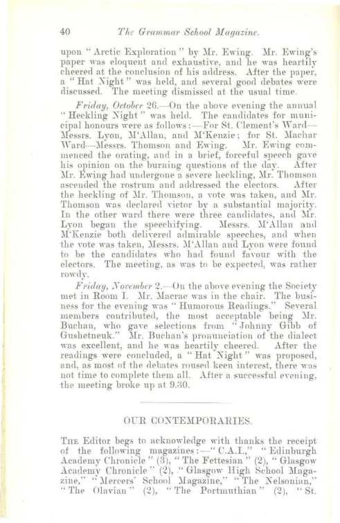 Friday, October ?G. On the abm·e e,·ening the annual ..Heckling ::'light,. was held. The cau<li<latrsfor municipal ho11ourswere as £allows:-For St. ('lemenfs ,,arcl)Iessrs. Lyon, )I·.i.l]an, and )I·Kenzie: £or St. )lachnr 1Yarcl-1Iessrs. Thomson and Ewing. )Ir. Ewing commenced tl1e orati11g, and in a briPf, forceful s1wrch gaYe his opiniou on thf' burning questions of the tlay. .\.£ter 1Ir. Ewing had undergone a SPYereheckling, )Ir. Thomson ascf'nded the rostrum antl atldressecl the elPctors. .\.fter the heckling of )fr. Thomson, n YOte was taken, nnd 1[r. Thomson wa~ declare<l Yictor by a substantial mnjority. In the other ,rnrd thei-e "ere three cancliclatc~. and )Ir. L~·on began the speechifying. )fossrs. )I'..\.llan and ~I·Eeuzie both drli,·ered a<lmirnblr speechrs, ,llHl when thr Yote wns taken, )Ies;;,rs. )l' ..:\.llnn and Lyon were :found to be the cnndidatPs "·ho had found faY0111' "·itb 1.he electors. The meetiug, as "·as to be expec1.rcl,,Yns ratl1er l'OW<l:--