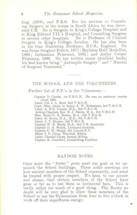 WE hall burden ,ou with uo tediou• (lissertation upon thP editorial pen as �e as ume its resprmsibilitie . Its rst task shall be tn o er tn nm· ma·ters, tn our schoolfello" , to all whn l'ea<l the e page , om heartiest greeting' upon the opening of this new �rssion. ~be11 we reassemble<l aftel' the holitlav (blest chY !), uni a fe"· familiar face were mi sing. • Snme of the <1lcl boys have entered the uivrr'ity: others have commenced a busiue career; but the be"t wishe o the whole Schoo] go forth to one �nd all. ThPir rrsponsibilities now devolve upon us, and 1t is our proud (luty to maintain the ancient houour of our Yenerable chool in Glas room aucl playing- eld alike. The past-a pa t that reaches far do"n the dim centuriPs -has been glorious indeed.