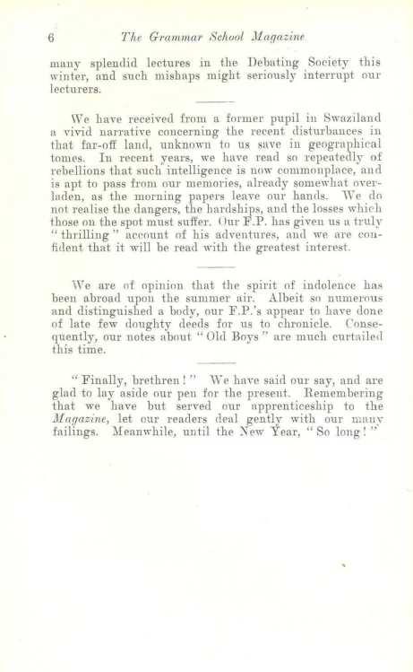 \Ve have received from a former pupil in Swaziland a Yivid narratiYe concerning the recent disturbance s in that far-off land, unknown to us save in geographical tomes. In recent years, we have read so repeatedly of rebellions that such intelligence is now commonplace, and is apt to pass from our memories, already somewhat overladen, as the morning papers leave our hands. \\"e do not realise the dangers, the hardships, and the losses whicl1 those on the spot must suffer. Our F.P. has given us a truly "thrilling" account of his adventures, and we are confident that it will be read "·ith the gr<'atest interest.