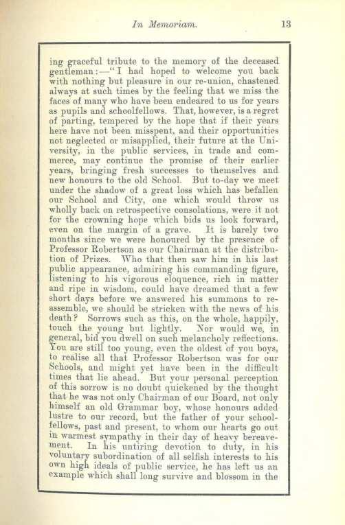 ing graceful tribute to the memory of the deceased gentleman: -" I had hoped to welcome you back with nothing but pleasure in our re-union, chastened always at such times by the feeling that we miss the £aces of many who have been endeared to us for years as pupils and schoolfellows. That, ho•wever, isaregret of parting, tempered by the hope that if their years here ha,e not been misspent, and their opportunities not neglected or misapplied, their future at the University, in the public services, in trade and commerce, may continue the promise of their earlier years, bringing fresh successes to themselves and new honours to the old School. But to-day we meet under the shadow of a great loss which has befallen our School and City, one which would throw us wholly back on retrospective consolations, were it not for the crnwning hope which bids us look forward, even on the margin of a grave. It is barely two months since we were honoured by the presence of Professor Robertson as our Chairman at the distribution of Prizes. ·who that then saw him in his last public appearance, admiring his commanding figure, listening to his Yigorous eloquence, rich in matter and ripe in wisdom, could have dreamed that a few short days before we answered his summons to reassemble, we should be stricken with the news of his death? Sorrows such as this, on the whole, happily, touch the young but lightly. Kor would we, in general, bid you dwell on such melancholy reflections. You are still too young, eYenthe oldest of you boys, to realise all that Professor Robertson was for our S_chools, and might yet have been in the difficult times that lie a.head. But your personal perception of this sorrow is no doubt quickened by the thought that he was not only Chairman of our Board, not only himself an old Grammar boy, whose honours added lustre to our record, but the father of your school~ellows, past and present , to whom our hearts go out m warmest sympathy in their clay of heayy bereaYement. In his untiring deYotion to duty, in his voluntary subordination of all selfish interests to his own high ideals of public sen-ice, he has left us an example which shall long survive and blossom in the