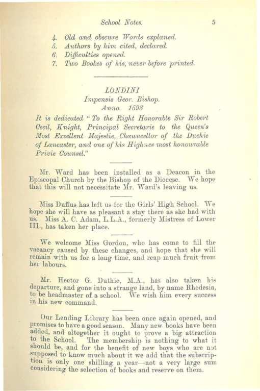 Mr. Hector G. Duthie, ~LA., has also taken his departure, and gone into a strange land, by name Rhodesia, to be headmaster 0£ a school. "\\re,,ish him e,ery success in his new command.