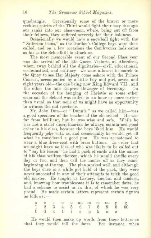 'l'he most memorable e,ent of our Second Class year was the arrival of the late Queen Victoria at Aberdeen, when, away behind all the dignitaries - civil, educational, ecclesiastica.l, and military-we were allowed to march to the Quay to see Her Maje;ty come ashore with the Prince Consort, accompanied by a little boy and girl, seven and eight years old- the one being now King Edward YII., and the other the late Empress-Dowager of Germany. On the occasion of the hanging of Christie or some other criminal the School was called in an hour or more earlier than usual, so that none of us might have an opportunity to witness the sad spectacle.