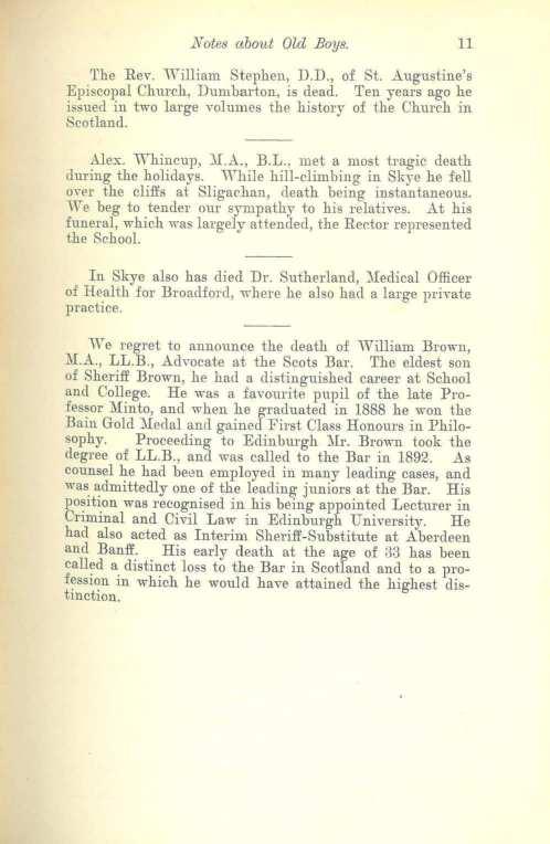 Ale:s:.v\"'hincup, :.U.A., B.L., met a most tragic death during the holidays. While hill-climbing in Skye he fell over the cliffs at Sligachan, death being instantaneous. We beg to tender our sympathy to his relati,es. At his funeral, which waslargely attended, the Rector represented the School.