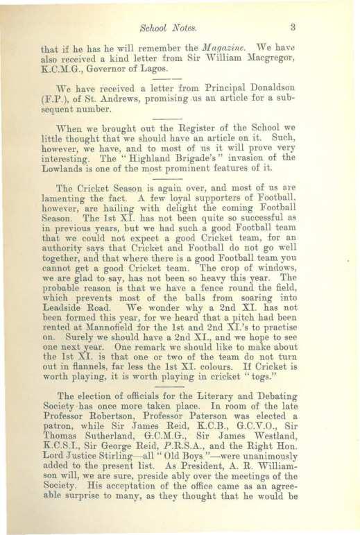 The election of officials for the Literary and Debating Society has once more taken place. In room of the late Professor Robertson, Professor Paterson was elected a patron, while Sir James Reid, K.C.B., G.C.V.O., Sir Thomas Sutherland, G.C.M.G., Sir James Westland, K.C.S.I., Sir George Reid, P.R.S.A., and the Right Hon. Lord Justice Stirling - all" Old Boys "-were unanimously added to the present list. As President, A. R. Williamson will, we are sure, preside ably over the meetings of the Society. His acceptation of the office came as an agreeable surprise to many, as they thought that he would be