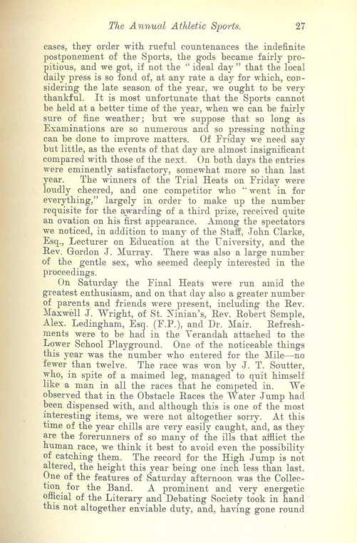 Our Sports have again passed, and to most of us the results are very satisfactory. We would congratulate the successful competitors, who are many in number. The success of the Sports is mainly due to the strenuous exertions of Rev. Mr. ·ward, who was ably seconded in all he did by the members of the Games and Sports Committee. In the name ofthe School, webeg to thank Mr. C. Davidson for his senices as Referee, and )Iessrs. )fackie and J. DaYiclsonwho acted as Judges, and we must not forget )Ir. Joseph, who so ably wielded the diminutive ''Long Tom." \Ve would particularly congratulate J. T. Soutter and W. \V. Jameson, who especially distinguished themselves in the Open Competitions. Our Sports have not in the least deteriorated, as we were half afraid they would, and the energy of this yea1·'sCommittee will compare fa,ourably with the exertions of any of their predecessors.