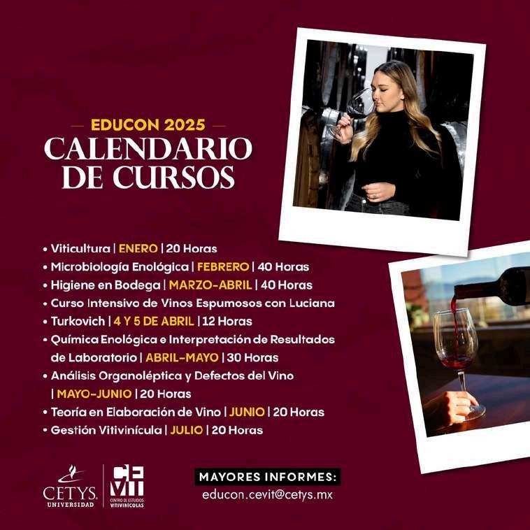 El Centro de Estudios Vitivinícolas (CEVIT) de CETYS Universidad presenta su calendario de educación continua para el primer semestre del 2025. Para recibir mayores informes y apartar tu espacio puedes escribir a educon.cevit@cetys.mx