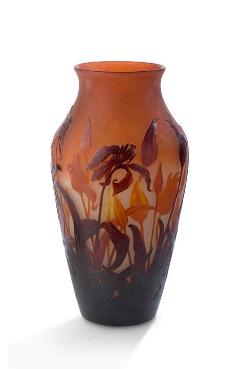 En verre multicouche brun sur fond orangé et blanc satiné, à décor gravé à l'acide d'iris.