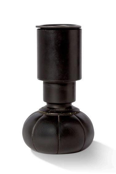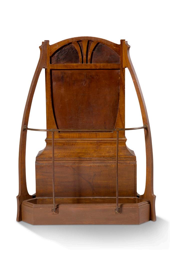 En chêne, le fond tendu de cuir brun, la partie inférieure parée de métal tubulaire formant réceptacle, la base et les montants partiellement laqués brun.