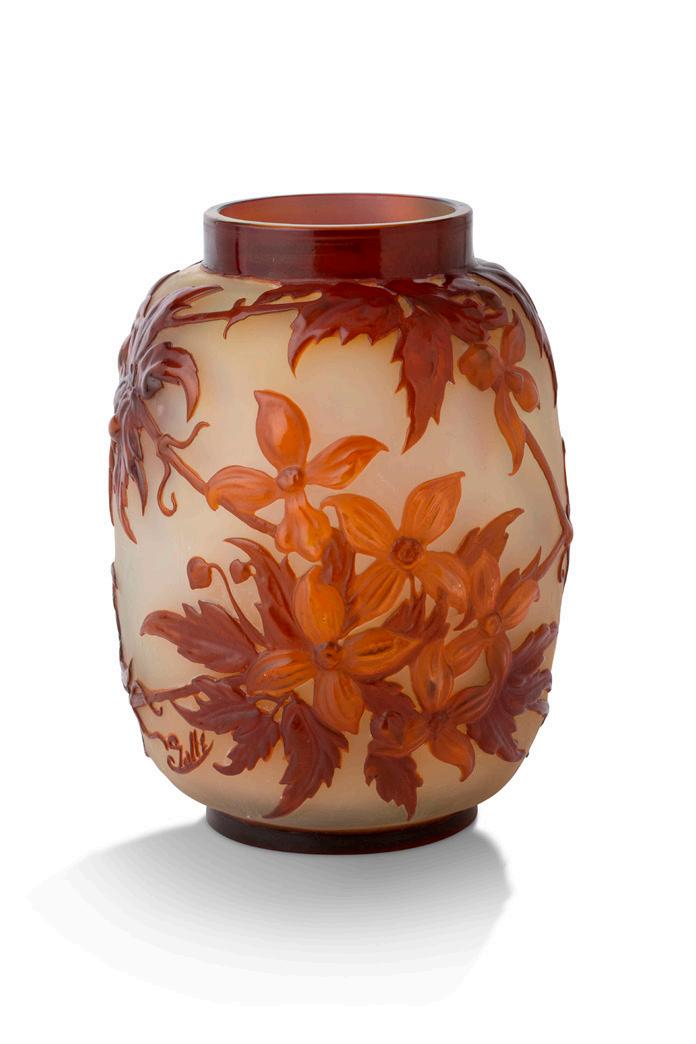 À col resserré, en verre multicouche orange sur fond jaune pâle satiné, à décor gravé à l'acide de clématites.