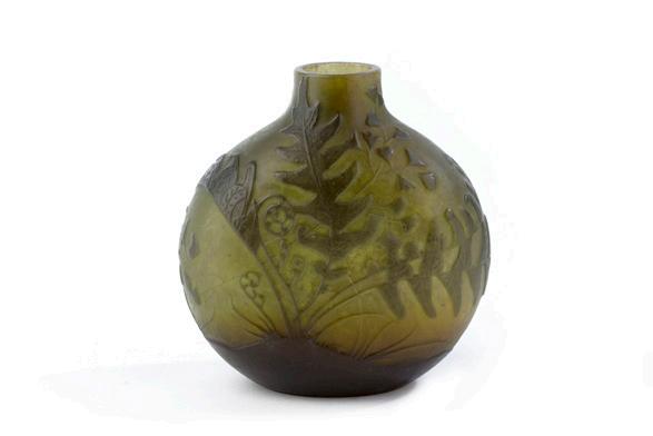 À long col et panse globulaire, en verre multicouche vert nuancé orange sur fond givré et légèrement irisé, à décor gravé à l'acide et émaillé pourpre de papillon, fruits et branches feuillagées, le col rehaussé d'or.
