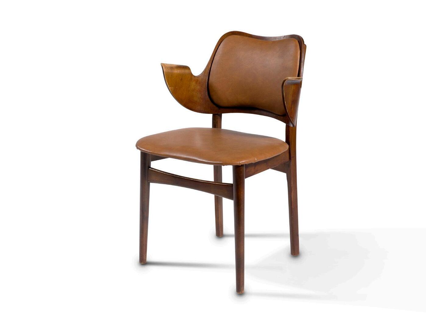 En noyer, le dossier garni de cuir brun estampé à décor floral, l'assise recouverte de cuir grainé bordeaux.
