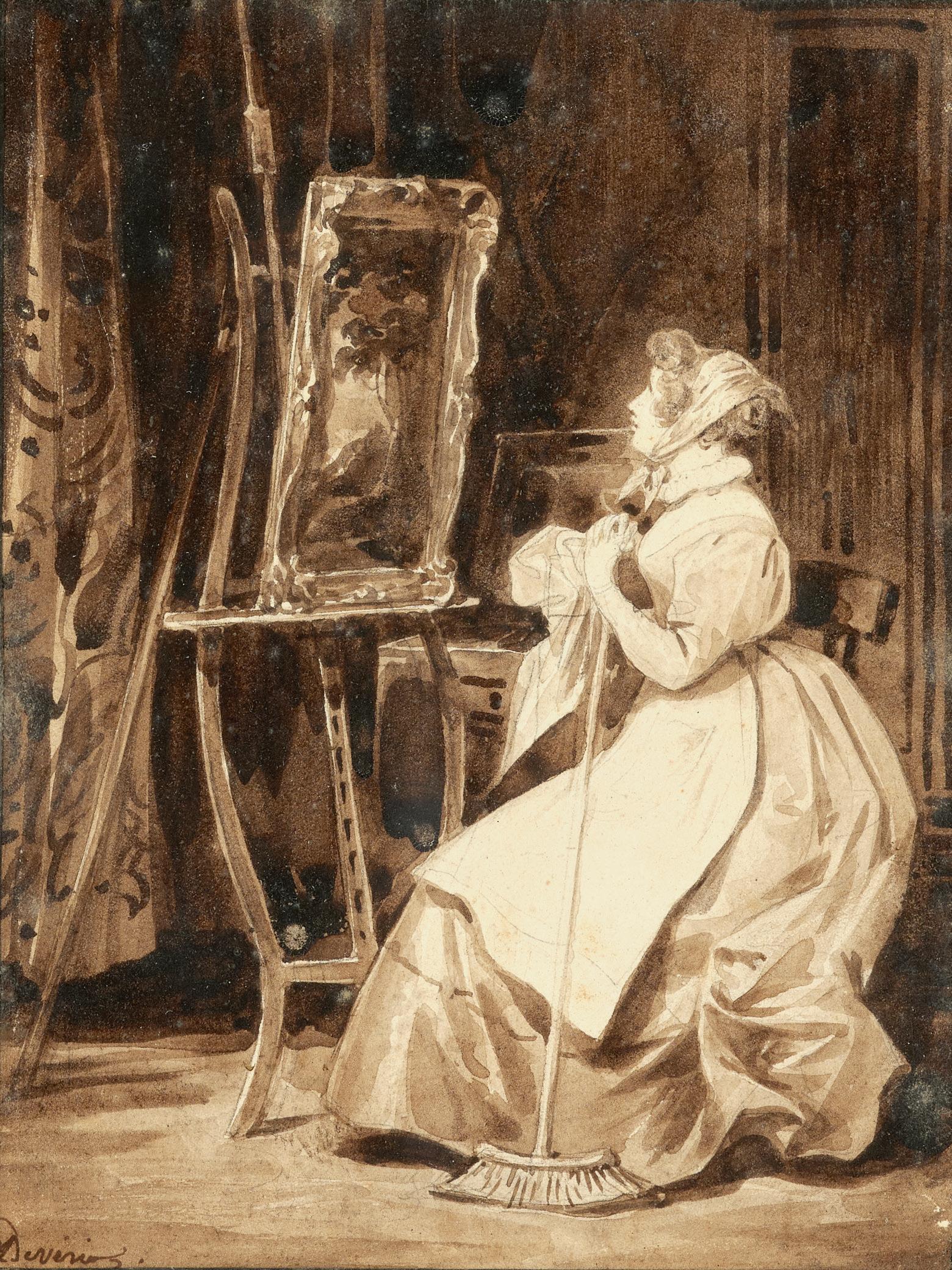Ce dessin présente ce qui a sans doute pu séduire Baudelaire dans les œuvres de notre artiste : une charmante scène d’intérieur, où une servante inter rompt son travail le temps de se plonger dans la beauté d’un paysage posé sur un chevalet.