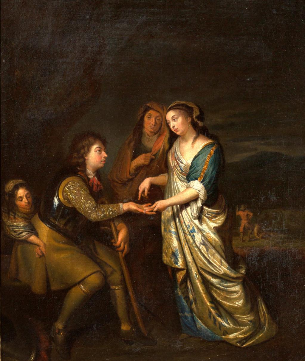 Cette charmante paire de tableaux attribuée à Jan Verkolje représente pour l’un une Diseuse de bonne aventure, sujet profane importé directement d’Italie, et pour l’autre Sarah présentant Agar à Abraham, sujet sacré s’il en est.