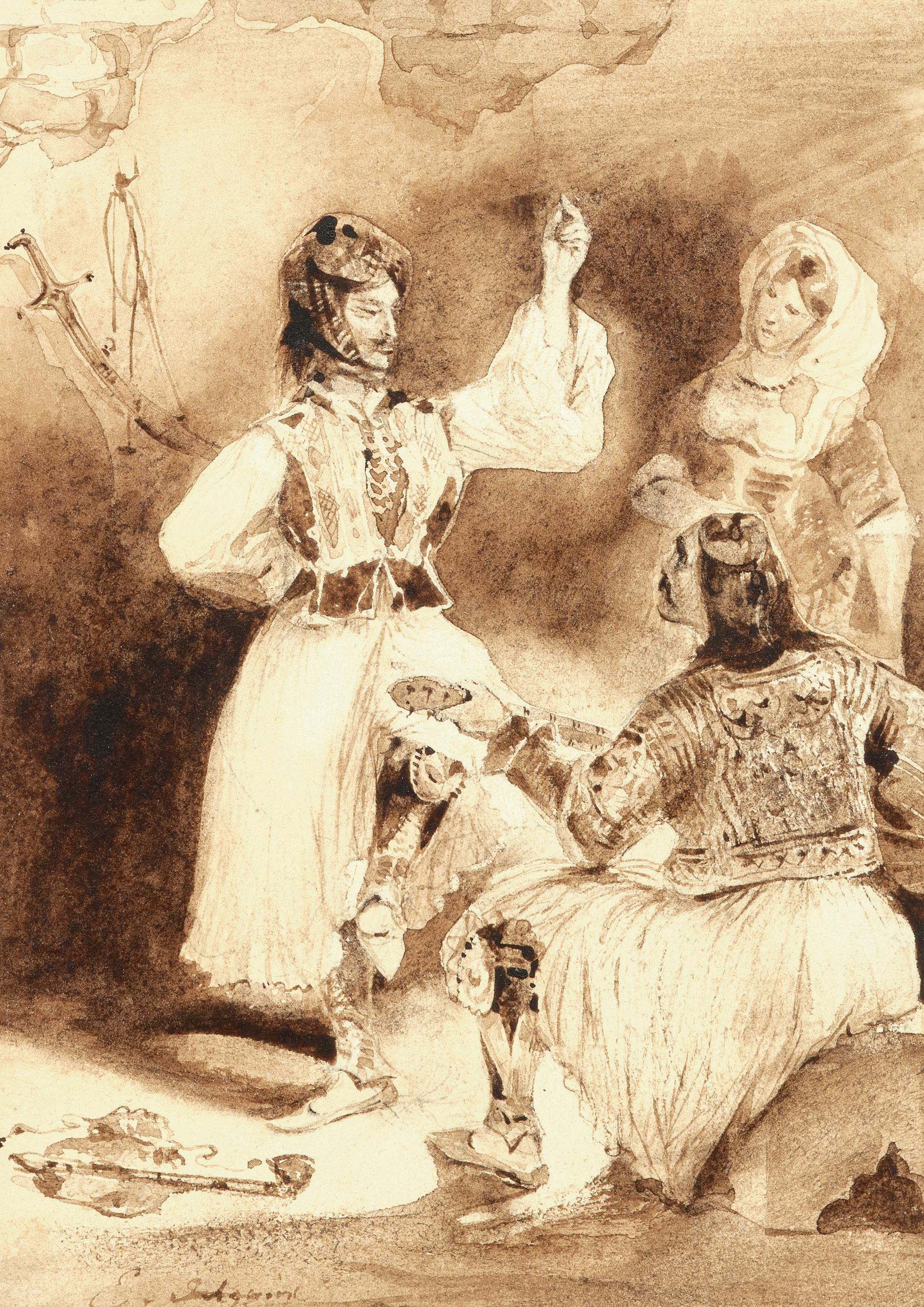 Musicien et danseur grecs Plume, encre brune et lavis brun Signé en bas à gauche E. Delacroix 18,9 x 13,4 cm