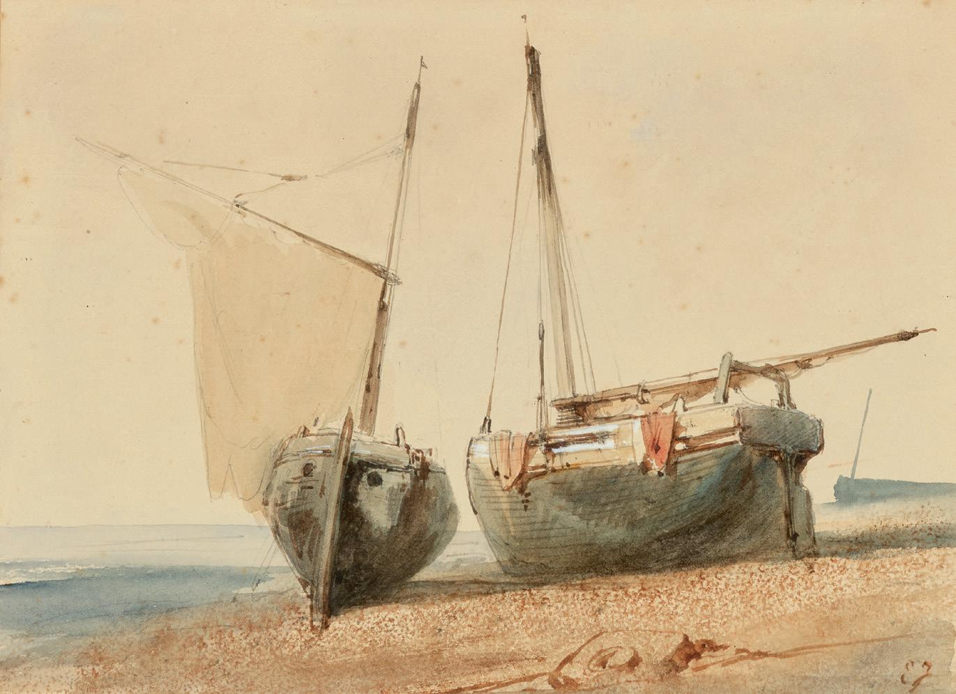 Two ships on a beach in Dieppe at low tide Watercolor and black chalk